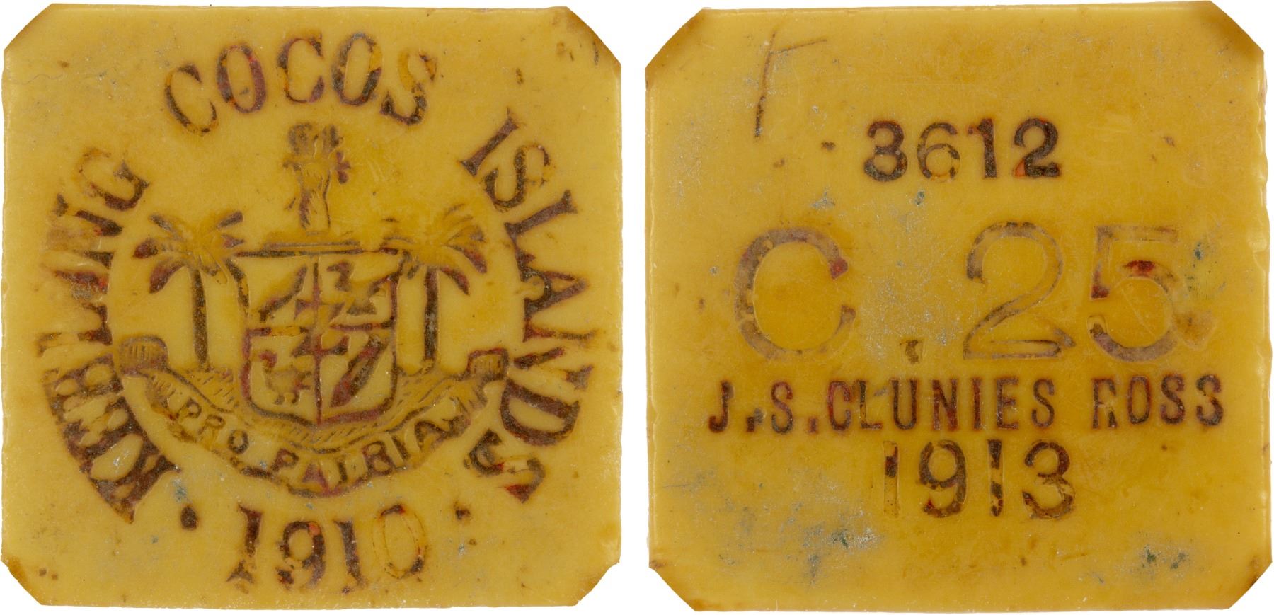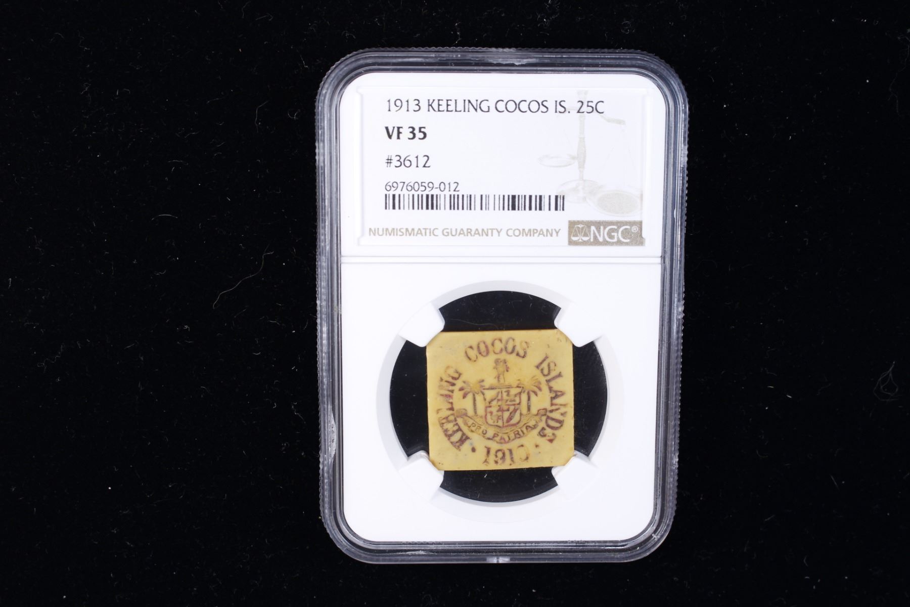 KEELING-COCOS ISLANDS: John S. Clunies-Ross, 25 cent token, 1913, KM-Tn3, square plastic "ivory" token, serial number 3612, NGC graded VF35.