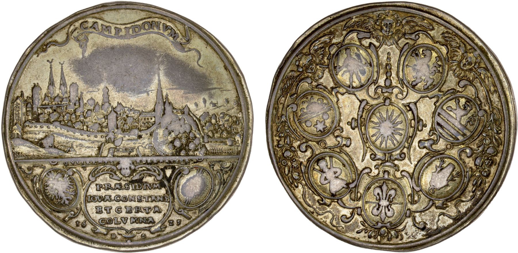 KEMPTEN: City, AR schauthaler (23.72g), 1625, Haertle-290, Nau-209, regimental thaler, city view of Kempten with banner inscribed CAMPIDONVM at top, with a cartouche below with inscription PRAESIDIVM / IOVAE CONSTANS / ET CERTA / COLVMNA and "16 - 25" at either side, with double-headed eagle shield and diagonal-line shield also to the sides // eight shields with the coats of arms of the council members (Gufer, Geiger, Dorn, Jensch, Stenglin, von Freyberger, König, and Kleinhaus [in the center]), with three angel heads at the top, and floral decorations and fruit at sides, probably gilt at one time, only traces remaining, light tooling within cartouche, very rare, plain edge, VG-F.