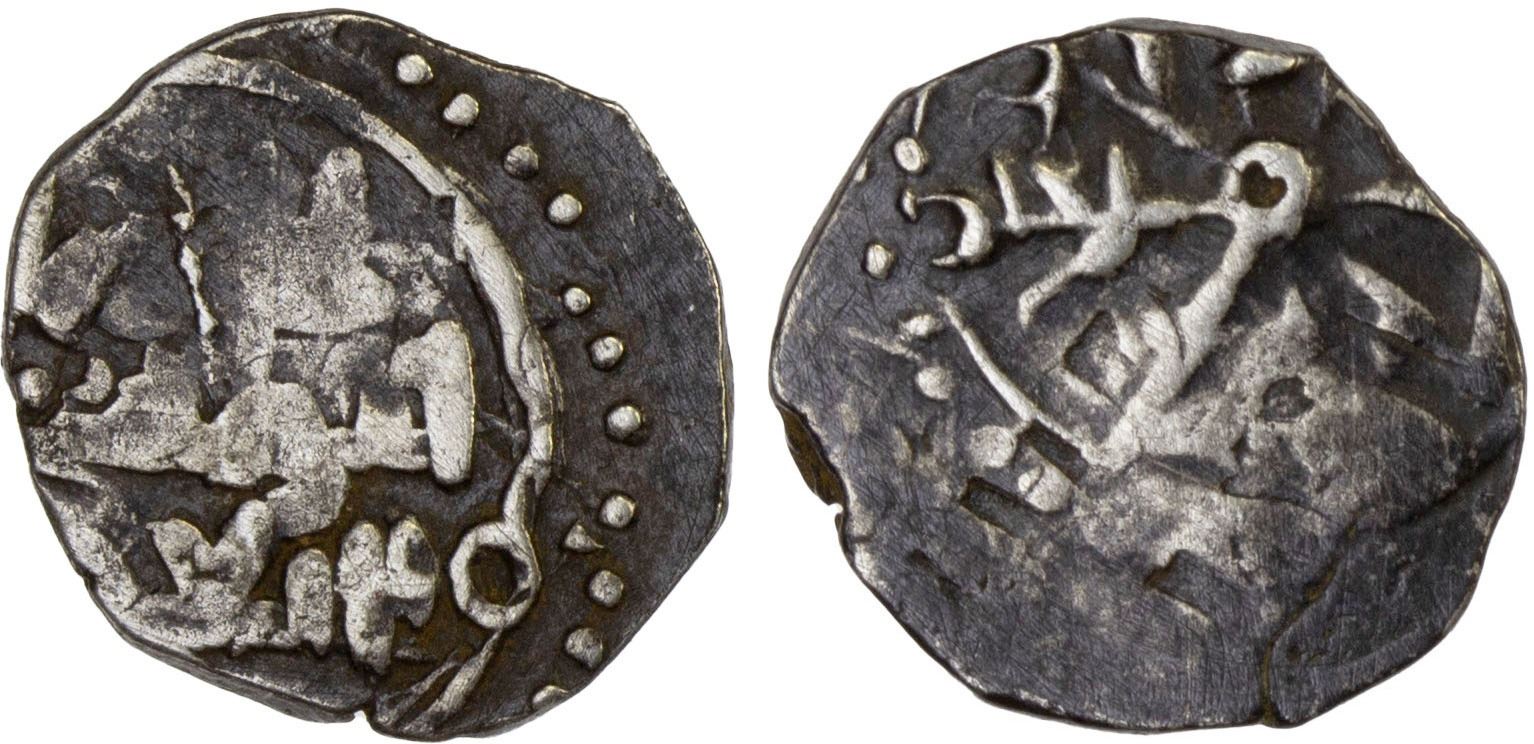 KHAZRUNID: Mas'ud II, ca. 1026-1053, AR qirat (0.96g), A-457, obverse legend .... / mas'ud, kalima reverse arranged in a four-arm design; probably the 4th known example of this subtype, F-VF, RRR. The ruler's dates have been corrected in the recent work by Nayera Rafik.
