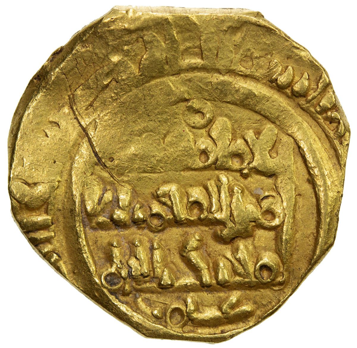 KHAZRUNID: Wanudin, ca. 1048, AV dinar (3.87g), MM, ND, A-455, Zeno-244180 (this piece), citing deceased caliph Hisham, traces of mint & date in obverse margin, and abbreviated form of ruler's name below the reverse, Wazin, short for Wanidin (sic), about 20% flat strike, VF, RRR.