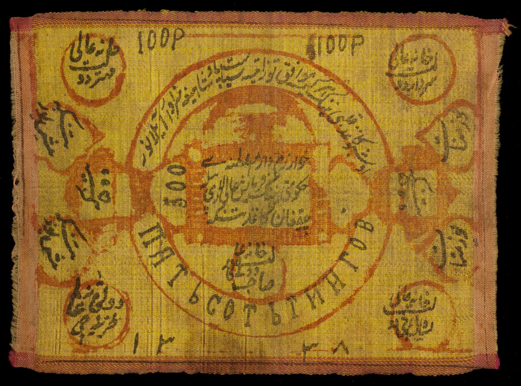 KHWAREZM: Khorezmian People's Soviet Republic, 100 rubles, AH1338, Pick-S1070, 114x151mm silk issue, black and red-brown on yellow with red-brown and pink irregular borders, VF, ex Dr. Robert A. Rosenfeld Collection.
