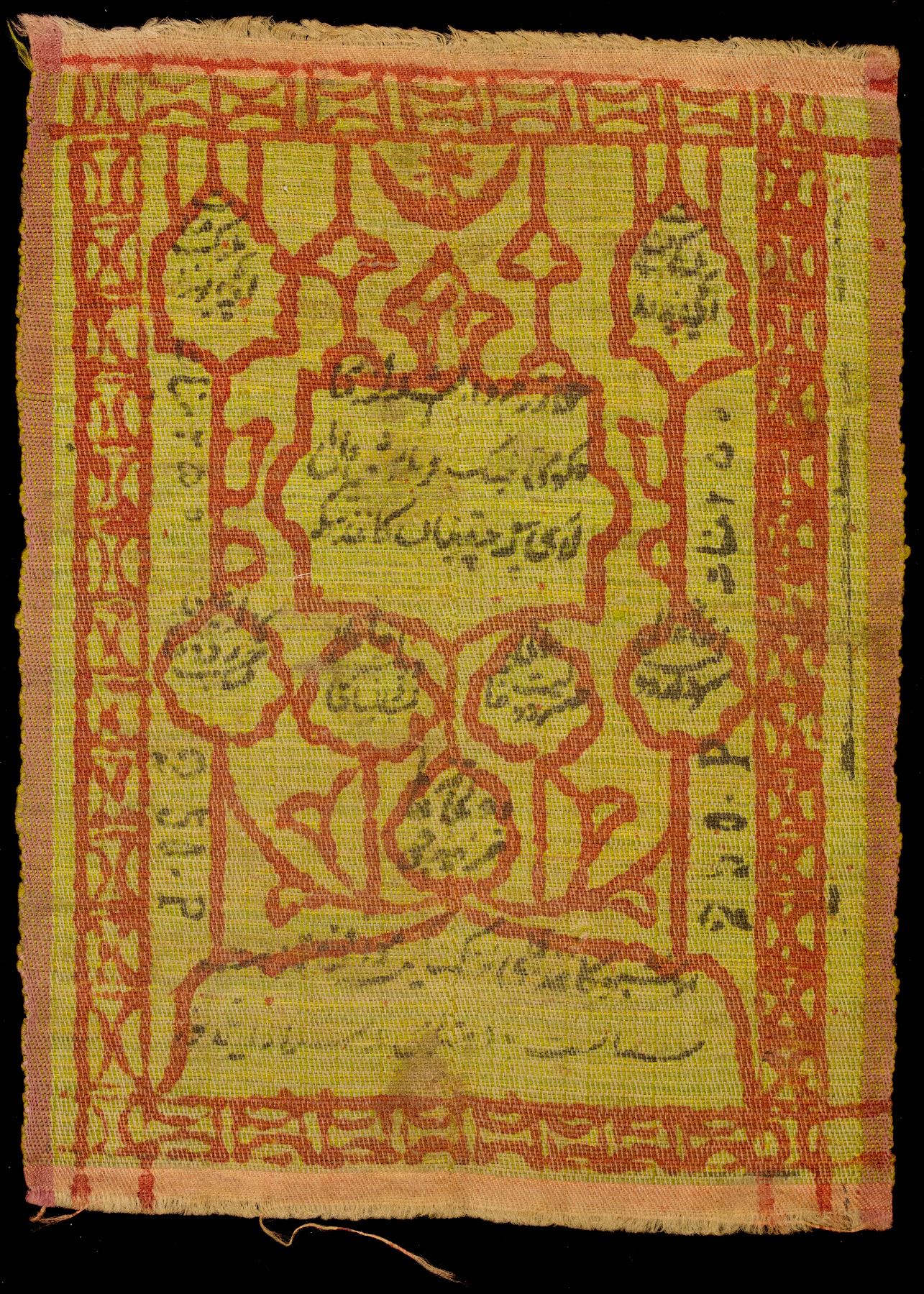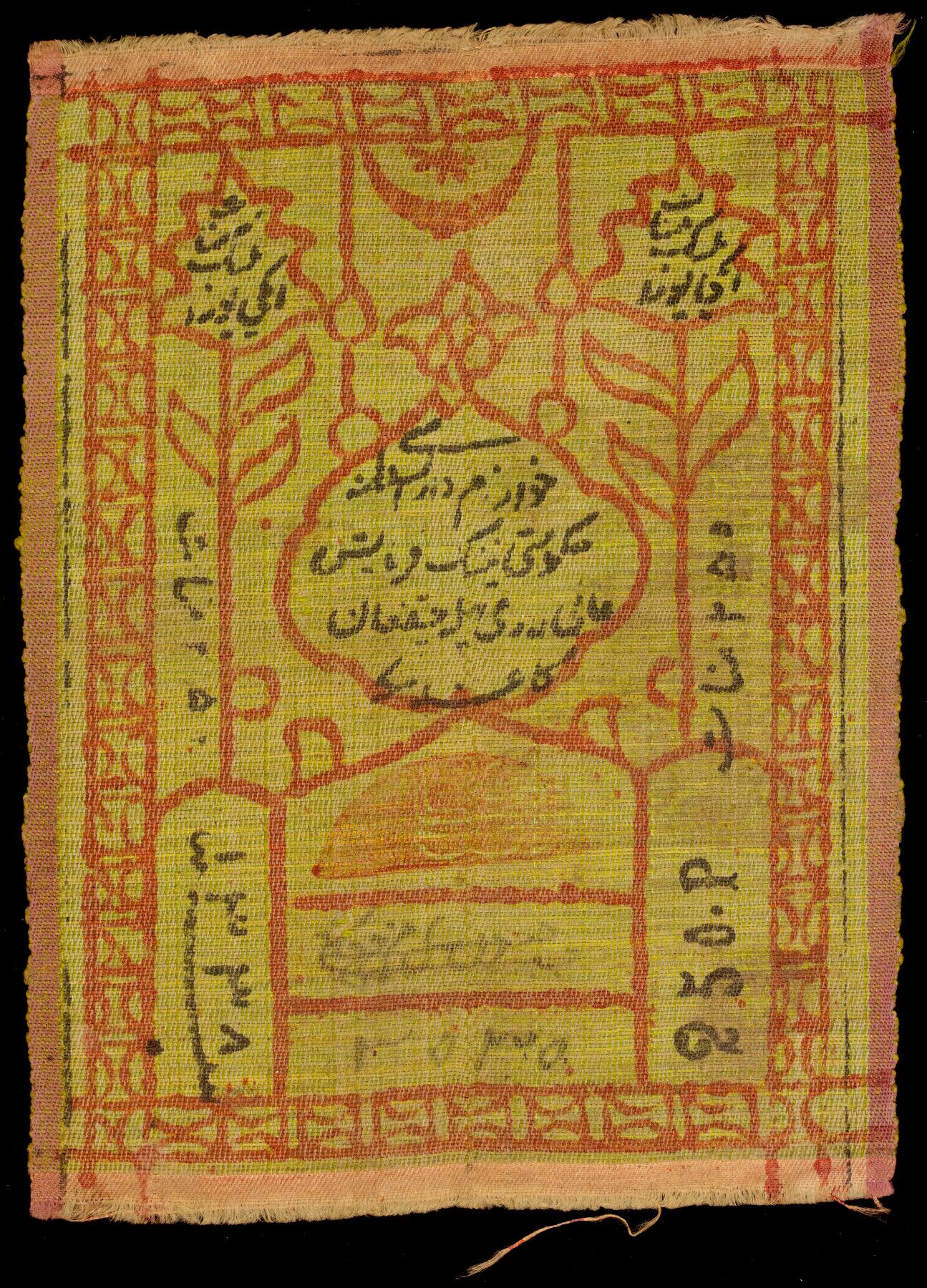 KHWAREZM: Khorezmian People's Soviet Republic, 250 rubles, AH1338, Pick-S1071, 118x152mm silk issue, black and red-brown on light green with red-brown and pink irregular borders, VF, ex Dr. Robert A. Rosenfeld Collection.