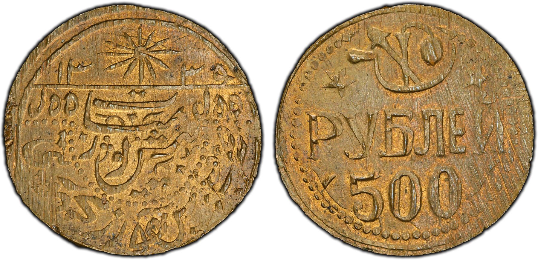 KHWAREZM: People's Soviet Republic, AE 500 roubles (4.96g), Khwarezm, AH1339 (1921), A-3089S, Y-18, NS-X82, broad flan type, strong strike, very nice for this extremely rare type! PCGS graded MS62, ex Dr. Wolfgang Schuster Collection. With denomination written in Russian Cyrillic and Turkmen Arabic scripts.