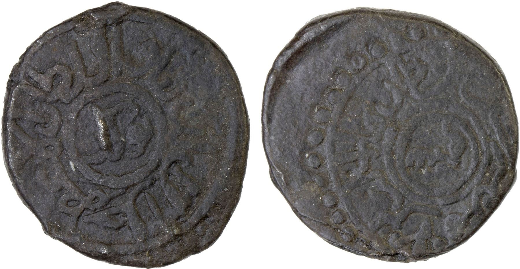 KHWARIZMSHAH: Mangubarni, 1220-1231, AE jital (2.94g), Tulak, ND, A-C1751, Tye-311/312, Dawar style, rare mint that should be in the Dawar region of southern or eastern Afghanistan, F-VF, RR.