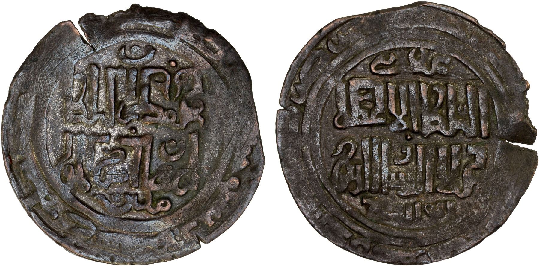 KHWARIZMSHAH: Muhammad, 1200-1220, AE broad dirham (4.64g), Balkh, A-1723, uncertain date, possibly ending in "5"; with the denominationÔã phrase 'allâni atop the obverse field; with traces of original silver wash, XF, RR.