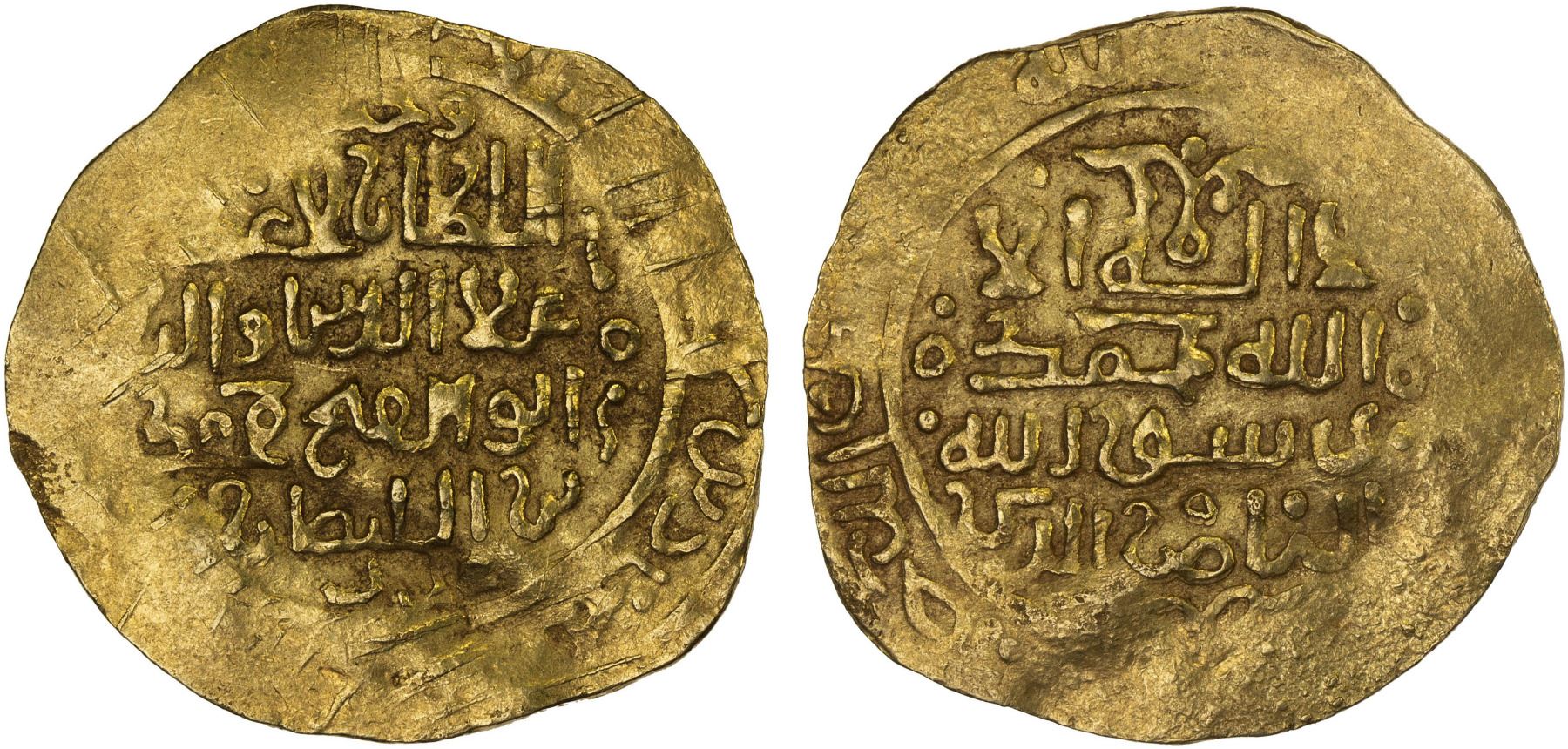 KHWARIZMSHAH: Muhammad, 1200-1220, AV dinar (3.61g), Wakhsh, DM, A-1712, mint name above the obverse field, about 15% flat strike; creased, VF, RR