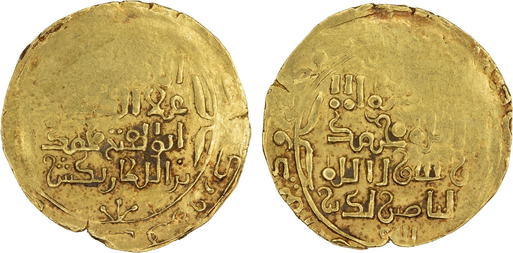 KHWARIZMSHAH: Muhammad, 1200-1220, AV dinar (4.00g), Firuzkuh, DM, A-1712, clear mint name; about 25% flat strike, VF, RR.