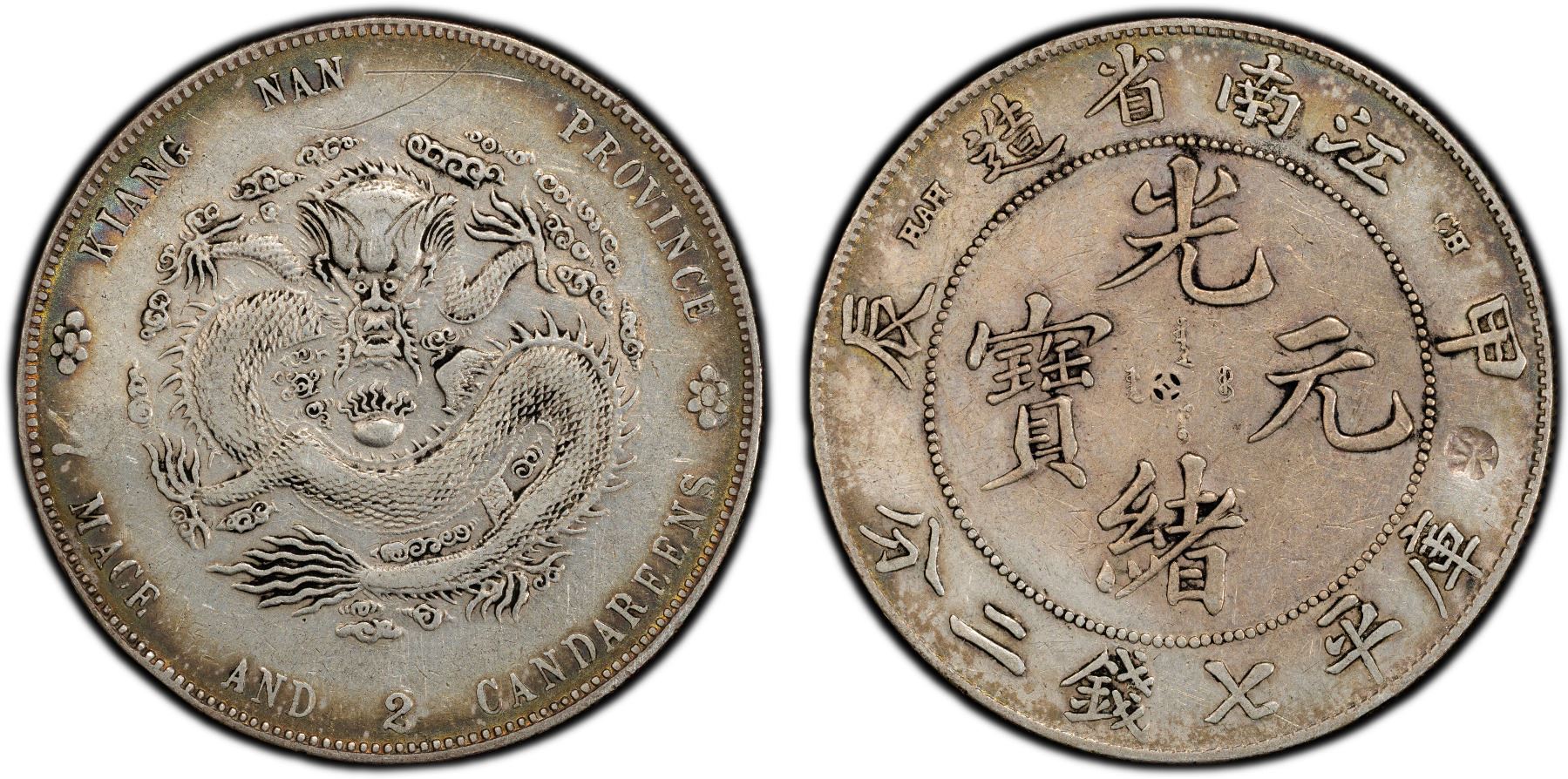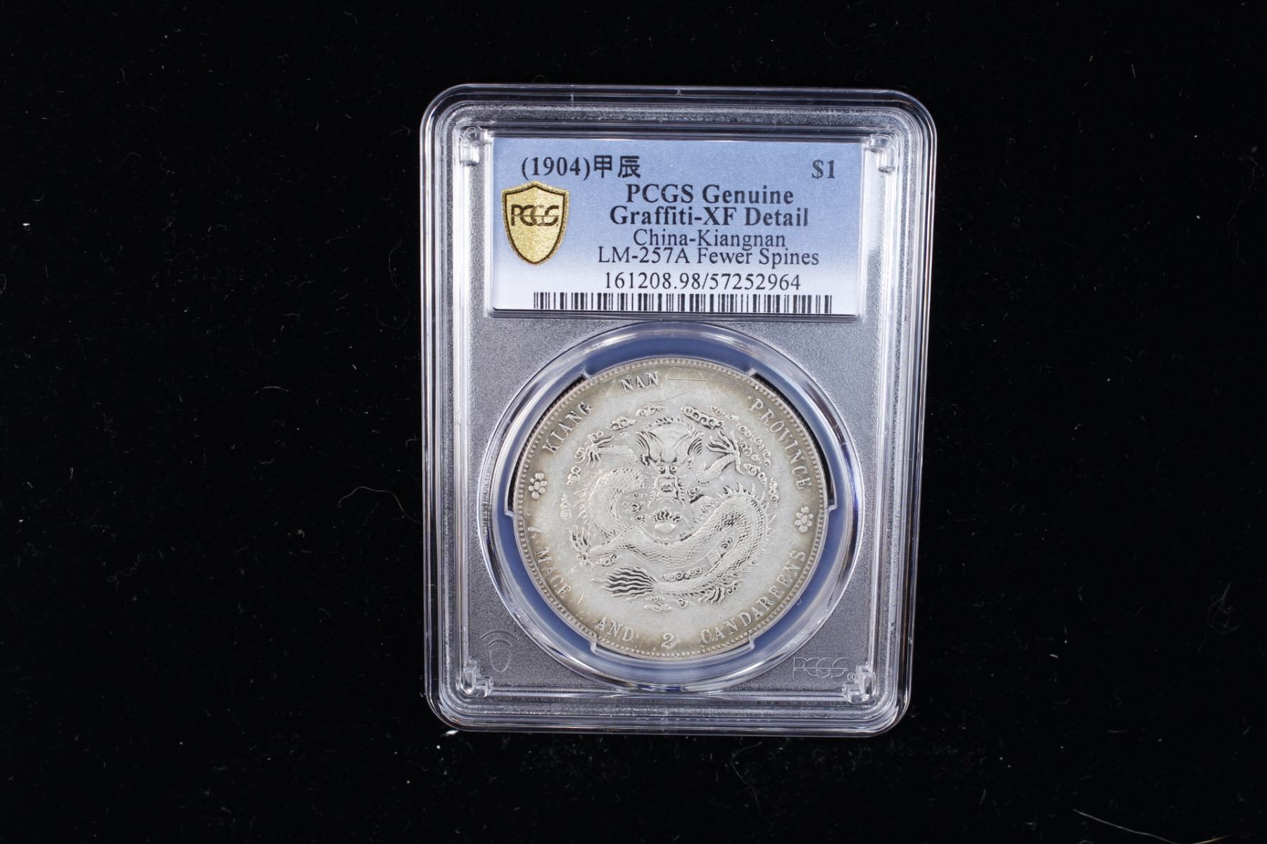 KIANGNAN: Kuang Hsu, 1875-1908, AR dollar, Nanking, CD1904, Y-145a.12, L&M-257A, K-99, variety without dots under "chia" and "chen" and with dragon with fewer spines, graffiti, PCGS graded XF details, ex Salvatore J. Falcone Collection.