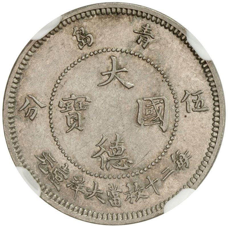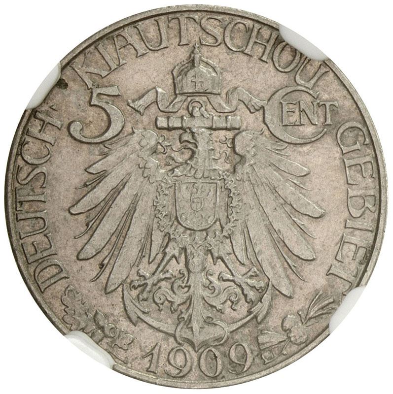 KIAUCHAU: Wilhelm II, 1888-1914, 5 cents, 1909, Y-1, German inscription, Deutsche Kiautschou Gebiert / Chinese inscription dà dé guó bao at center, qing dao above, NGC graded MS62.