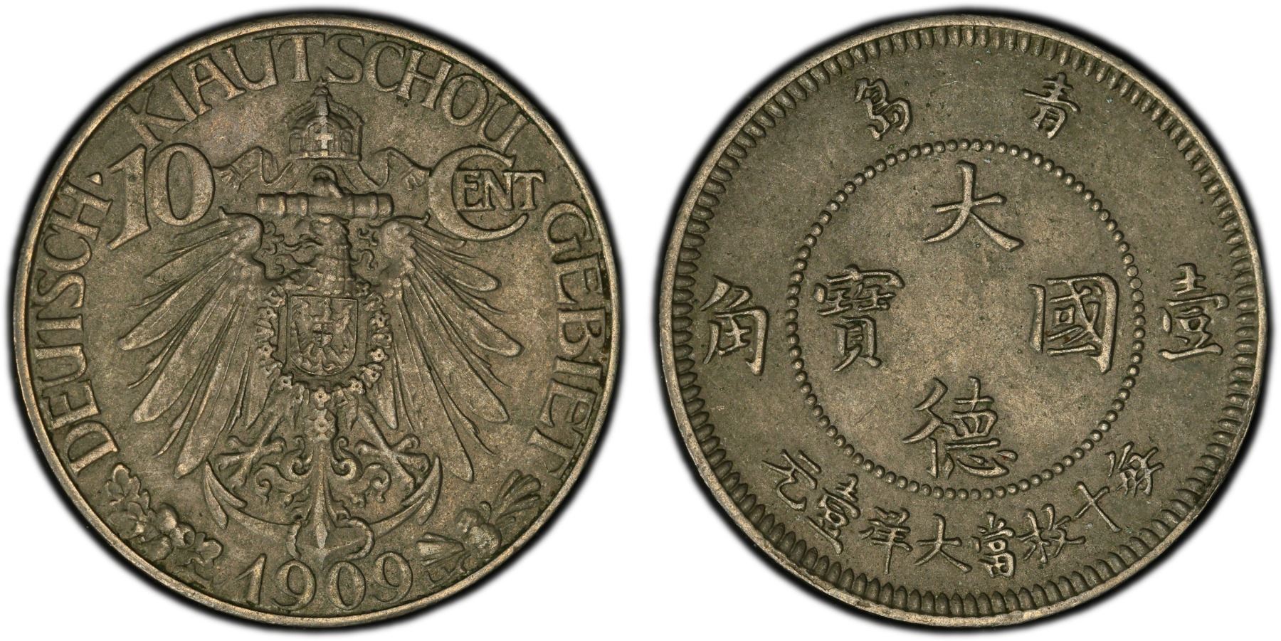 KIAUCHAU: Wilhelm II, 1898-1914, 10 cents, 1909, Y-2, J-730, Deutsche Kiautschou Gebiet // Chinese inscription dà dé guó bao at center, qing dao above, an attractive example, PCGS graded AU58. The Kiau Chau Bay concession (Kiautschou Bucht in German, Jiaozhou Wan in Chinese) was a territory leased by Germany from 1898 to 1914. The administrative center of the territory was located at Tsingtau (Qingdao). The Deutsch-Asiatische Bank issued copper-nickel 5 cents and 10 cents in October 1909 to cope with market confusion arising from the exchange between the Mexican 8 reales (which Chinese merchants commonly used) and the German mark. It was decreed that local authority had unlimited obligations to exchange these coins for Mexican 8 reales (as 1 yuan) and may not refuse them for transactions within 3 yuan. When Tsingtao was occupied by the Japanese military on November 7, 1914, these coins ceased to circulate.