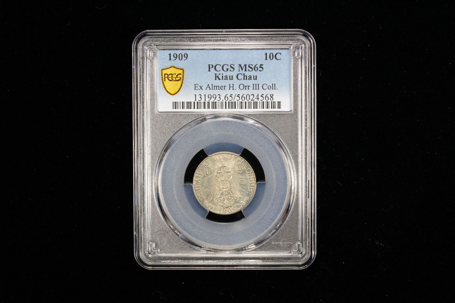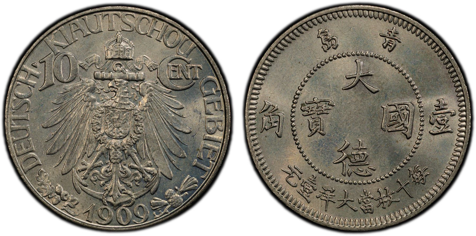 KIAUCHAU: Wilhelm II, 1898-1914, 10 cents, 1909, Y-2, J-730, Deutsche Kiautschou Gebiet // Chinese inscription dà dé guó bao at center, qing dao above, a superb mint state example! PCGS graded MS65. The Kiau Chau Bay concession (Kiautschou Bucht in German, Jiaozhou Wan in Chinese) was a territory leased by Germany from 1898 to 1914. The administrative center of the territory was located at Tsingtau (Qingdao). The Deutsch-Asiatische Bank issued copper-nickel 5 cents and 10 cents in October 1909 to cope with market confusion arising from the exchange between the Mexican 8 reales (which Chinese merchants commonly used) and the German mark. It was decreed that local authority had unlimited obligations to exchange these coins for Mexican 8 reales (as 1 yuan) and may not refuse them for transactions within 3 yuan. When Tsingtao was occupied by the Japanese military on November 7, 1914, these coins ceased to circulate.
