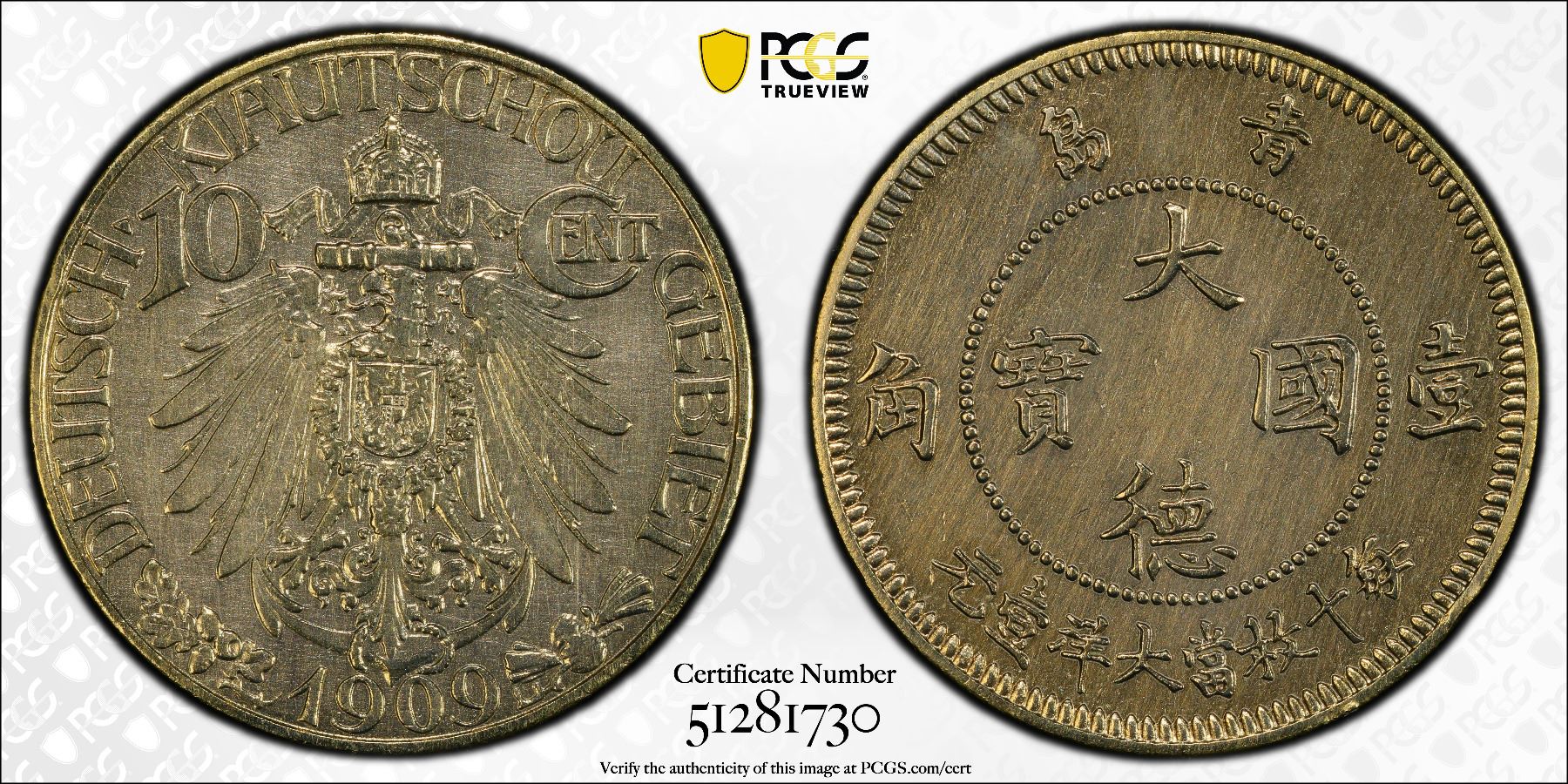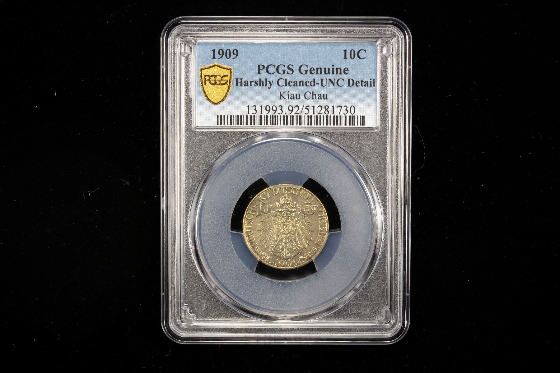 KIAUCHAU: Wilhelm II, 1898-1914, 10 cents, 1909, Y-2, J-730, Deutsche Kiautschou Gebiet // Chinese inscription dà dé guó bao at center, qing dao above, harshly cleaned, PCGS graded UNC details. The Kiautschou Bay concession was a territory leased by the Germans in Imperial and Early Republican China, lasting from 1898 to 1914. The administrative center of the territory was located at Tsingtau. A brewery was established in 1903 by German settlers (Tsingtao Brewery Co.), and still exists today as China's most famous brewery.