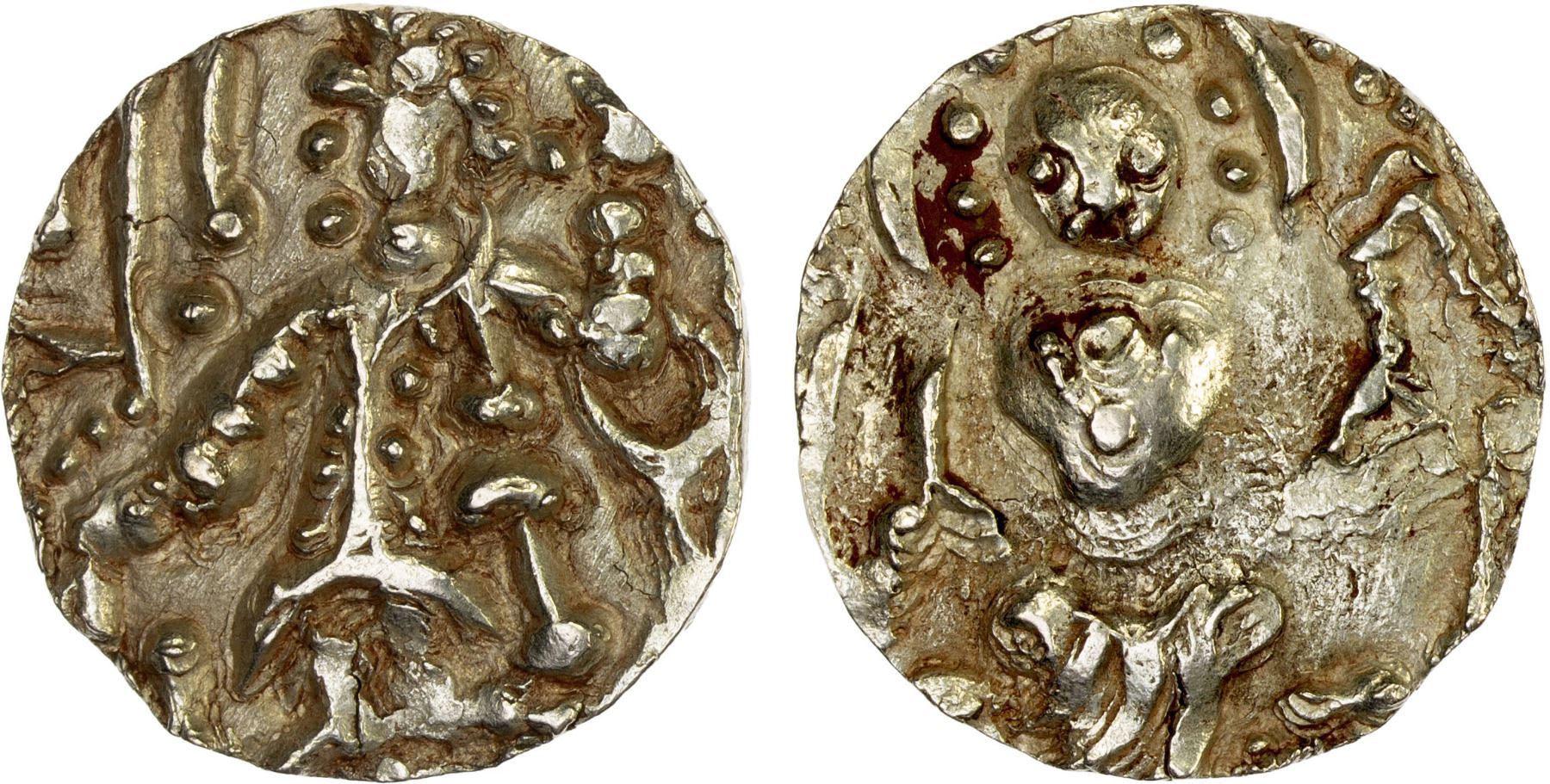 KIDARITE: Sri Saha, ca. 5th/6th century, debased AV dinar (7.32g), Donum-Burns-1593/96, king standing, with crudely engraved name kidara below his left arm // deity Ardoksho holding cornucopia, also very crudely engraved, choice XF, RR. Tentative attribution by Göbl. Gold fineness unknown, but likely somewhere in the 40-60% range.