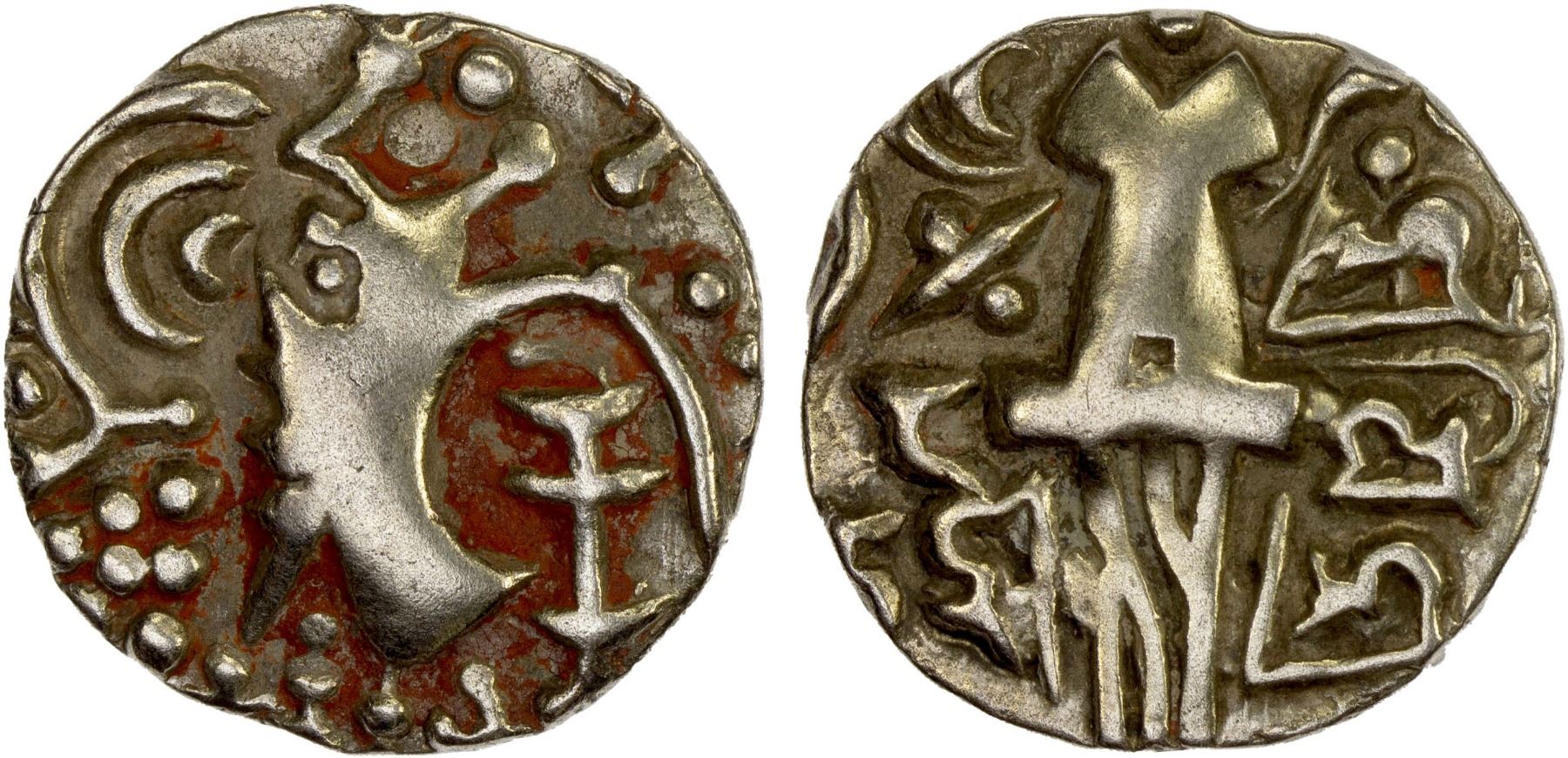 KIDARITE: Vigrahatunga, 7th/8th century, debased AV dinar (7.31g), Mitch-365o, Cribb-30, highly stylized king standing left, Brahmi kidara to the left // abstract Ardoksho seated facing, sri vigraha / tunga in Brahmi, lightly gilt, VF-XF.