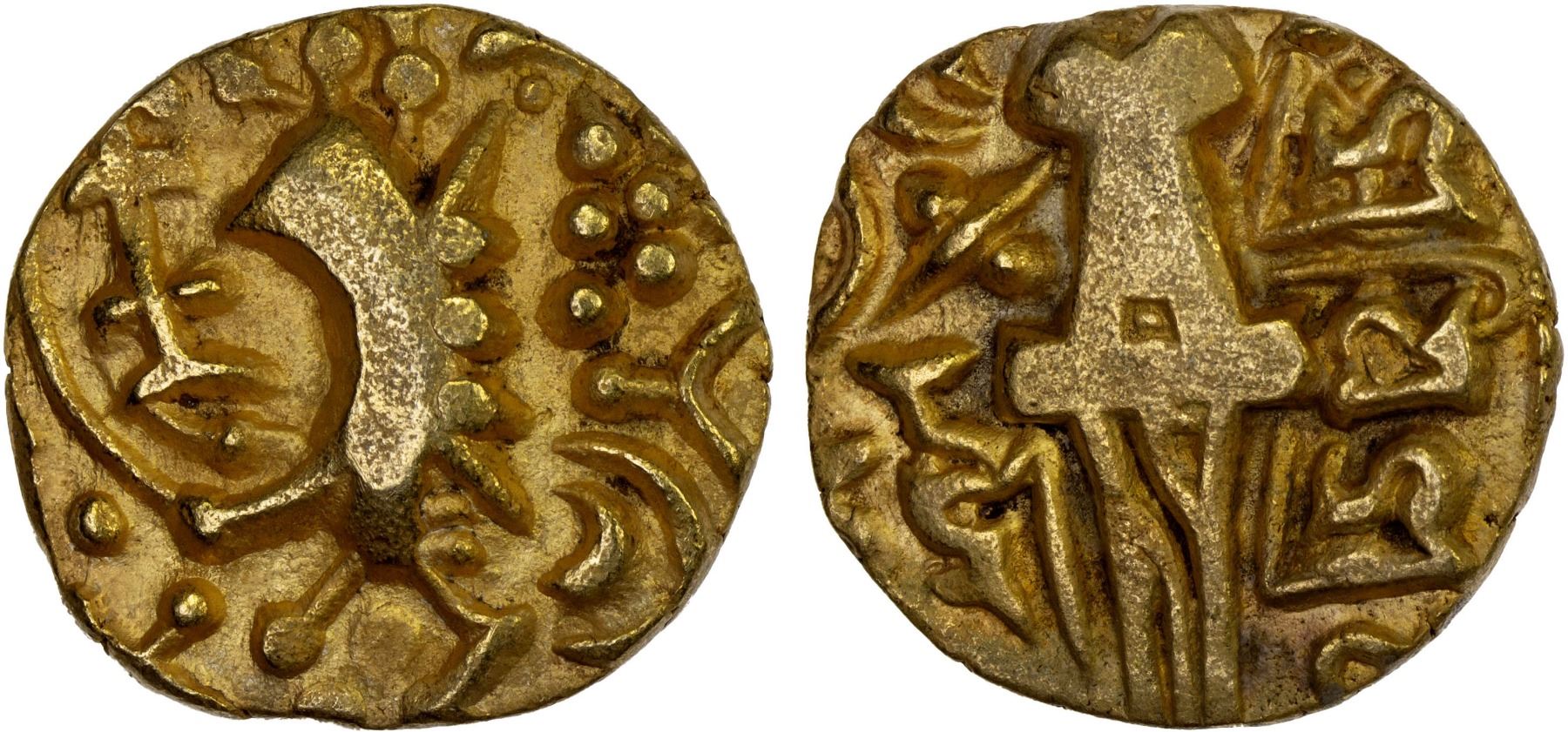 KIDARITE: Vigrahatunga, 7th/8th century, debased AV dinar (7.44g), Mitch-3650, highly stylized king standing left, Brahmi kidara to the left // abstract Ardoksho seated facing, sri vigraha / tunga in Brahmi, gilt, VF.