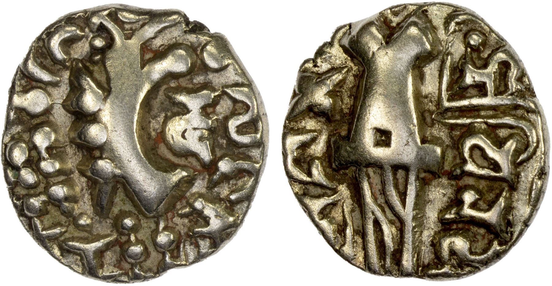 KIDARITE: Vinayaditya, ca. 776-807, debased AV dinar (7.64g), Mitch-3656/60, highly stylized king standing left // abstract Ardoksho seated facing, sri vinaya / ditya in Brahmi, lightly gilt, VF-XF.