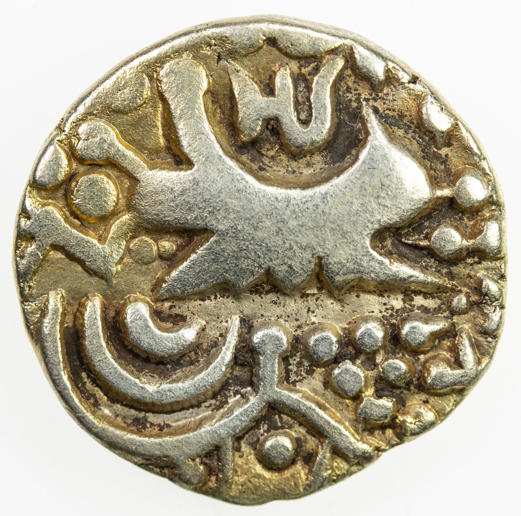 KIDARITE: Vinayaditya, late 5th century, debased AV dinar (7.17g), Mitch-3656, stylized Kushan king standing // stylized enthroned Goddess Ardoksho, sri vinaya /ditya, VF.