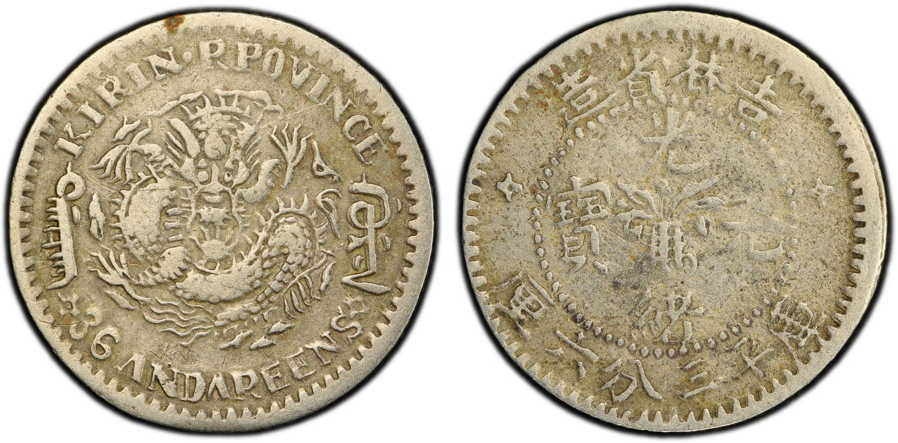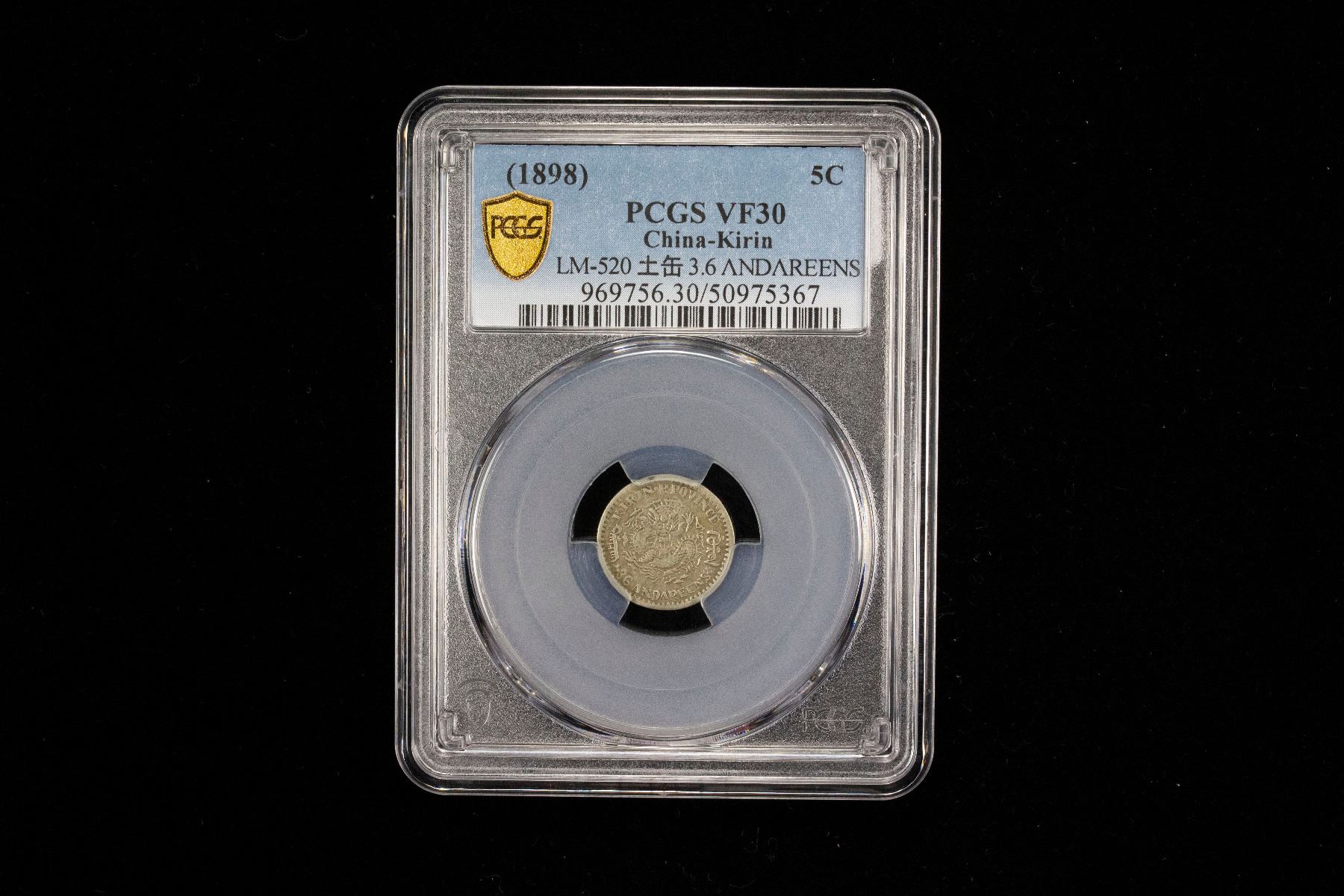 KIRIN: Kuang Hsu, 1875-1908, AR 5 cents, ND (1898), Y-179, L&M-520, variety with error in legends, KIRIN RPOVINCE / 36 ANDAREENS, PCGS graded VF30. This is the only example of this legend error variety certified by PCGS as of May 2025.