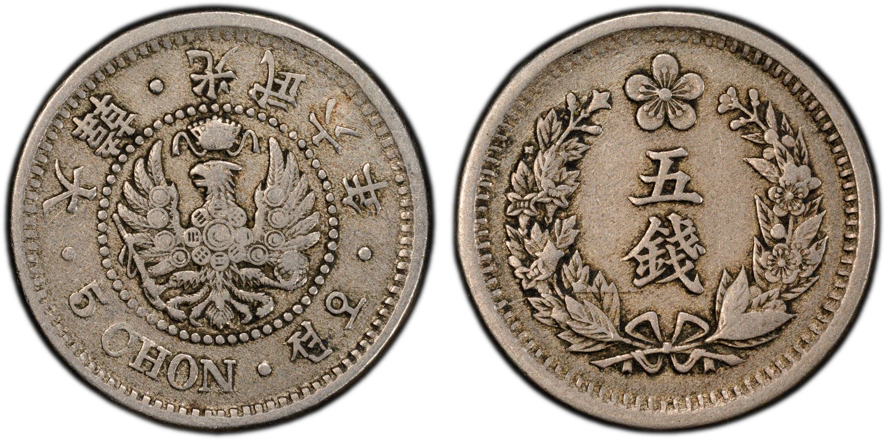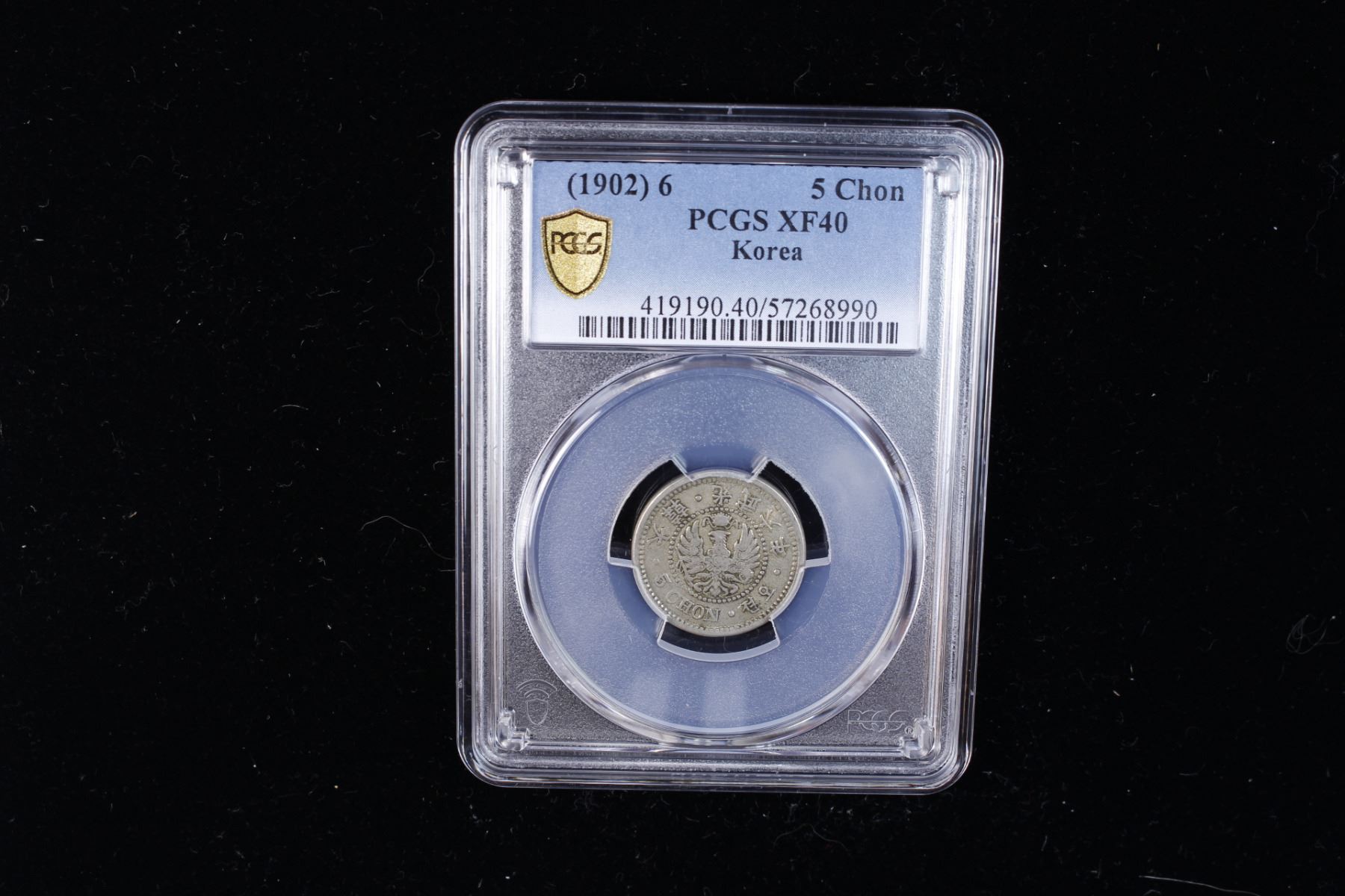KOREA: Kuang Mu, 1897-1907, 5 chon, year 6 (1902), KM-1122, Russian Influence series, one year type struck at the Yongsan mint, PCGS graded EF40. Between 1898 and 1905, Russia actively pursued its imperialistic ambitions in Korea, aiming to expand its dominance and secure strategic gains in the region. The design of this one-year type shows that influence with a Russian style eagle with eight Korean taegukgi and trigrams on the wings representing water, heaven, thunder, wind, mountain, earth, lake, and fire and a central taegeuk at center. Russia's defeat in the Russo-Japanese War of 1904-05 ended its designs on the Korean Peninsula. This has always been a popular issue in Korean numismatics and scarce in any condition.Minting equipment from the Incheon mint was moved to Yongsan in September of the year 1900 and cupronickel coins at this time were struck in small quantities. The Korean government, under pressure, signed a treaty recognizing Japanese protection on February 23, 1904. The Yongsan mint would close in November 1904 after the Japanese occupation began.