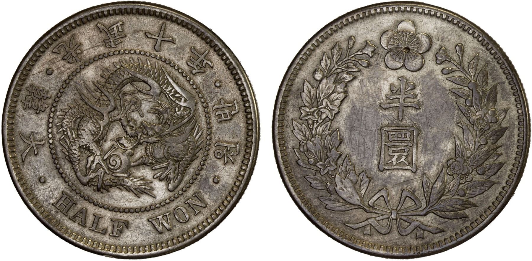 KOREA: Kuang Mu, 1897-1907, AR 1/2 won, year 10 (1906), KM-1129, harshly cleaned, VF-XF.