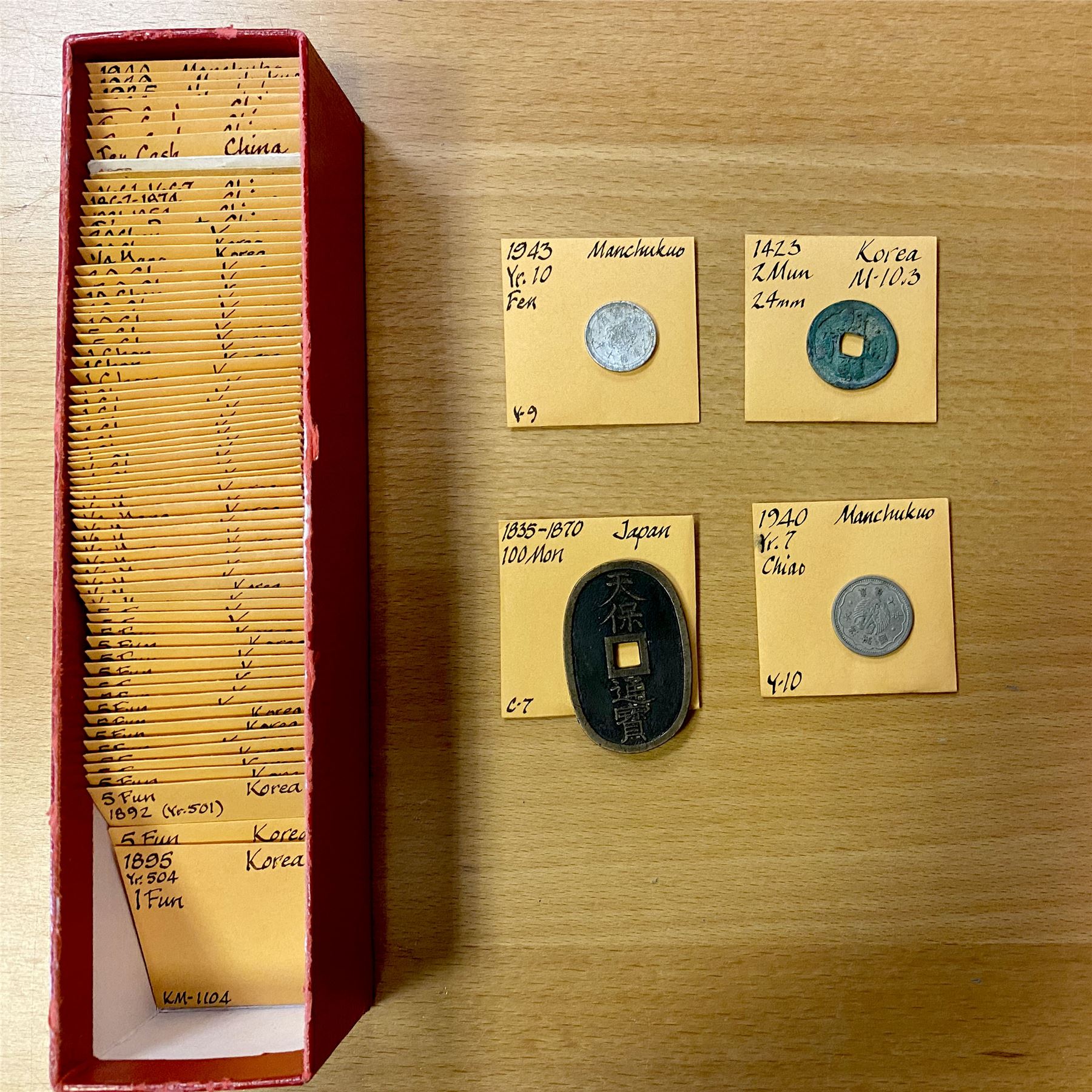 KOREA: LOT of 75 coins, including a mixture of machine struck Korean coins including 1 fun 1895, 5 fun 1892 (3), 1893, 1894, 1895 (6), 1896 (3), 1898, 1902 (2), 1/4 yang 1893, 1898 (1), 1898 (10), silver 1 yang 1892, 1893, 1/2 chon small size 1906 (2), 1908 (2), 1 chon 1907 (3), 1908 (2), 1909, 1 chon large size 1905, 1906 (2), 1907, 5 chon 1905, 1907, silver 10 chon 1906, 1908, 1910 (2), silver 20 chon 1907, 1909, contemporary copies of 20 chon (2), plus Chinese cash coins Tang dynasty (1), Qing dynasty (6), Chinese machine struck 10 cash coins (4), Manchukuo coins (6), Korea cho son tong bo cash coin, and Japan tenpo tsuho 100 mon coin, average quality examples, a wonderful little collection and well worth viewing, retail value $1200, lot of 75 coins.