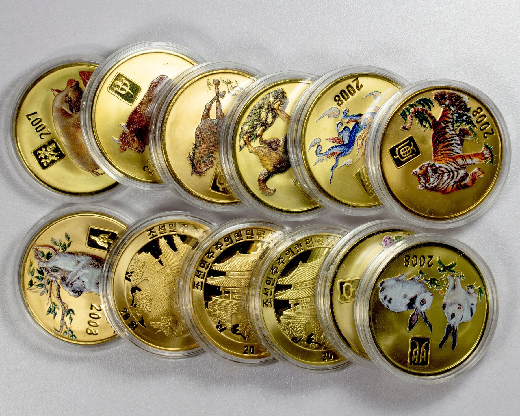 KOREA (NORTH): SET of 12 coins, 2005-2008, multicolored 20 won coins featuring animals of the Chinese Lunar Zodiac on gilt brass: Rat, Ox, Tiger, Rabbit, Goat, Horse, Snake, Dragon, Monkey, Rooster, Dog, and Pig (KM-478, 480, 482, 484 through 491, with Dragon unlisted), in individual capsules, set of 12 coins, Choice Proof.