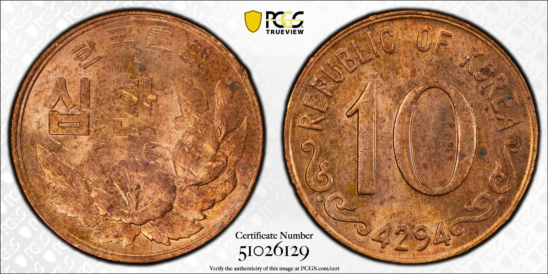 KOREA (SOUTH): Republic, AE 10 hwan, KE4294 (1961), KM-1, Rose of Sharon (Hibiscus syriacus), South Korea national flower, questionable color, PCGS graded Unc details.