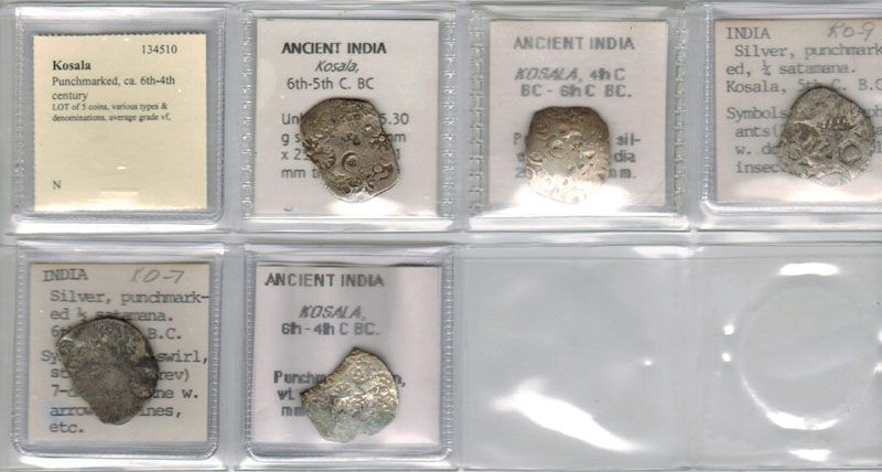 KOSALA: Punchmarked, ca. 6th-4th century, LOT of 5 coins, various types & denominations, average grade vf, nice group, lot of 5 coins, ex. John Page Collection.