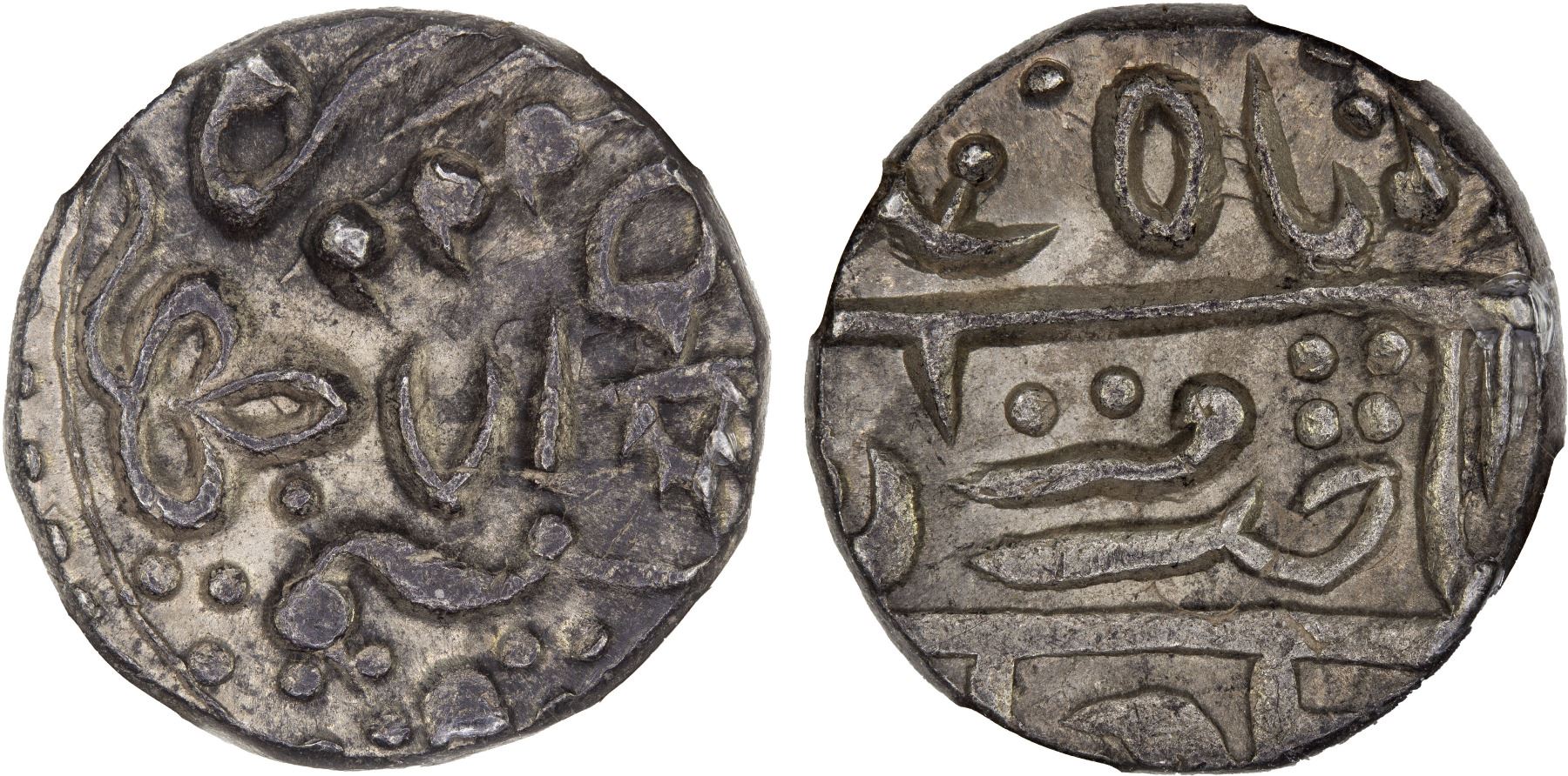 KOTAH: Kishor Singh II, 1819-1828, AR rupee (Nandgaon), year 18 (1825), Cr-30c-var, in the name of Muhammad Akbar II with his title sahib qiran, but differently arranged from the standard issues of this type, incorrectly dated 1875 on the slab, NGC graded MS61, RRR. This appears to be the only recorded example of ths subtype, previous sold in Stack's Collector's Choice in 2023, lot 73629, but misattributed as type Y-6, which is in the name of the Queen of England.