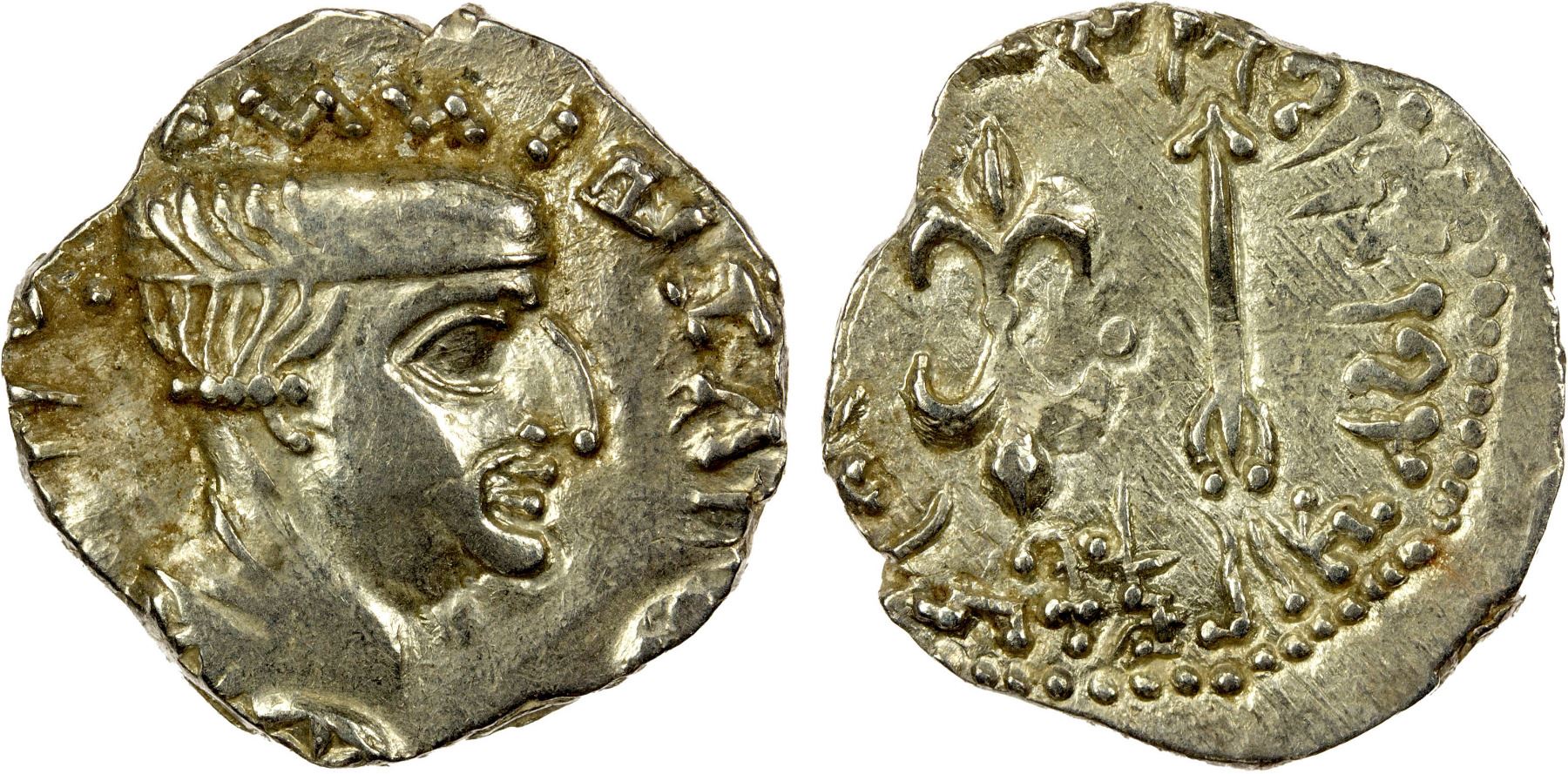KSHAHARATAS: Nahapana, ca. 40-78 AD, AR drachm (2.20g), Senior-303, Pieper-3353, king's bust right, Greek legend // arrow & thunderbolt, bilingual legend around, bold strike, superb condition, choice EF, RR, ex Wilfried Pieper Collection.