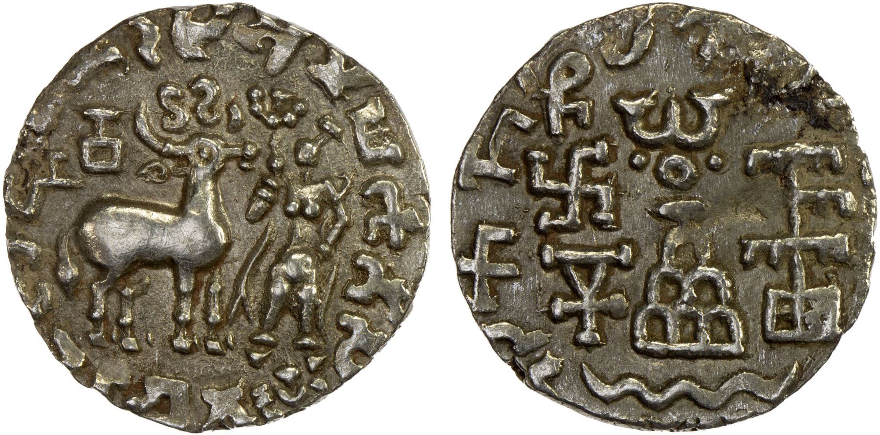 KUNINDA: Amoghabhuti, 2nd/1st century BC, AR drachm (2.02g), Mitch-4440-45, Pieper-1201, deer standing right, facing Lakshmi holding lotus, vase and srivatsa above // hill with indradhvaja, swastika, nandipada and railed tree around, river below, XF.