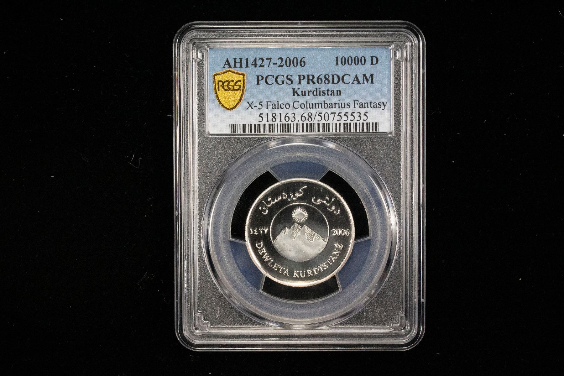 KURDISTAN: Republic, AR 10,000 dinars, 2006/AH1427, KM-X5, Merlin Falcon (Falco Columbarius), fantasy coinage, struck at the Patrick Mint, Santa Rosa, USA, a spectacular reflective proof example! PCGS graded Proof 68 DCAM.