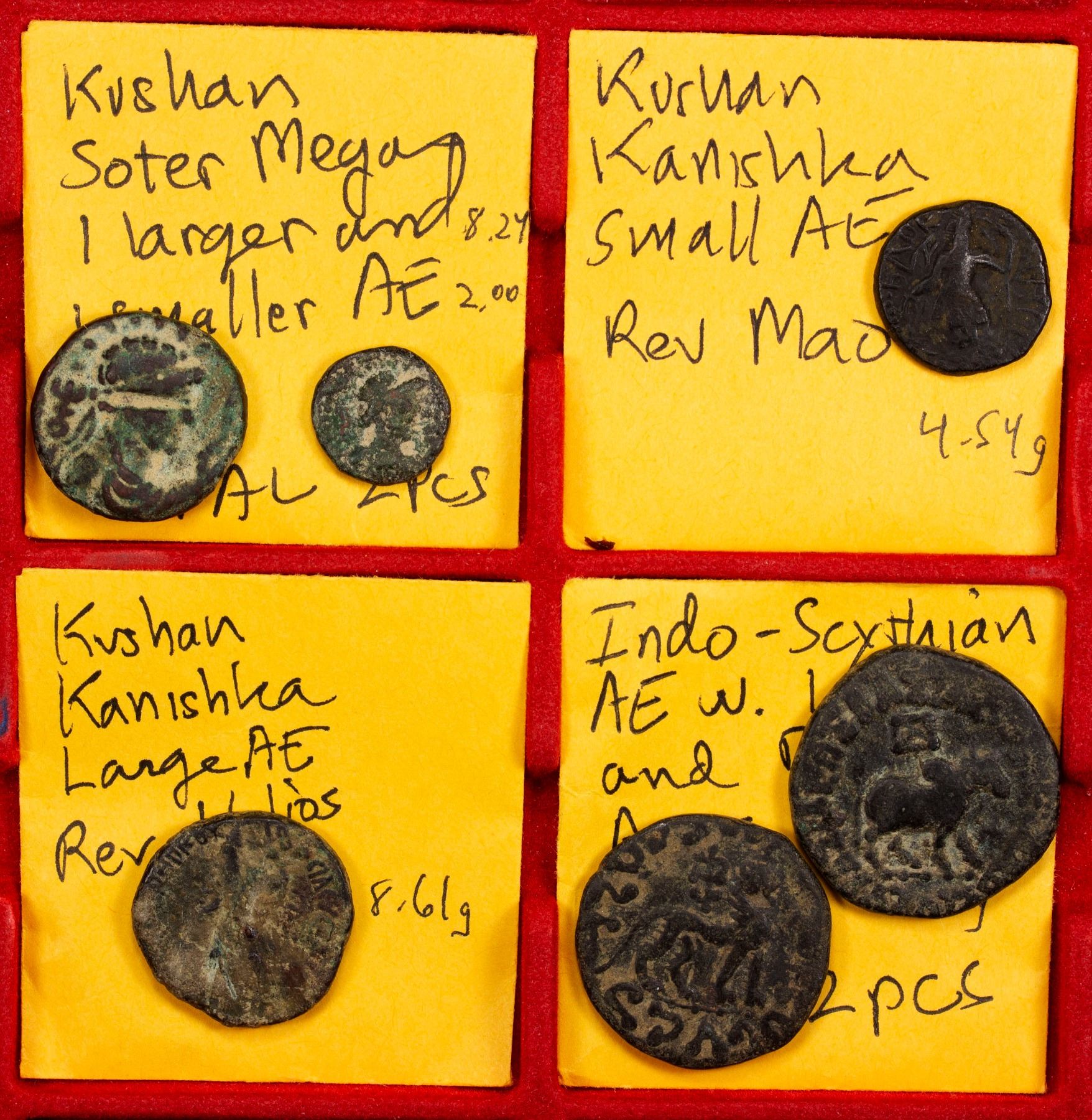KUSHAN & INDO-SCYTHIAN: LOT of 6 copper coins, including Kushan: Vima Takto (Soter Megas): one large (8.24g) and one small (2.00g), both with bust right // horseman; Kanishka: 1/2 unit with Helios (8.61g) and 1/4 unit with Mao (4.25g); and Indo-Scythian: Azes: lion // bull (2 pcs, 12.05g and 13.58); average F-VF condition; retail value $260, lot of 6 pieces.