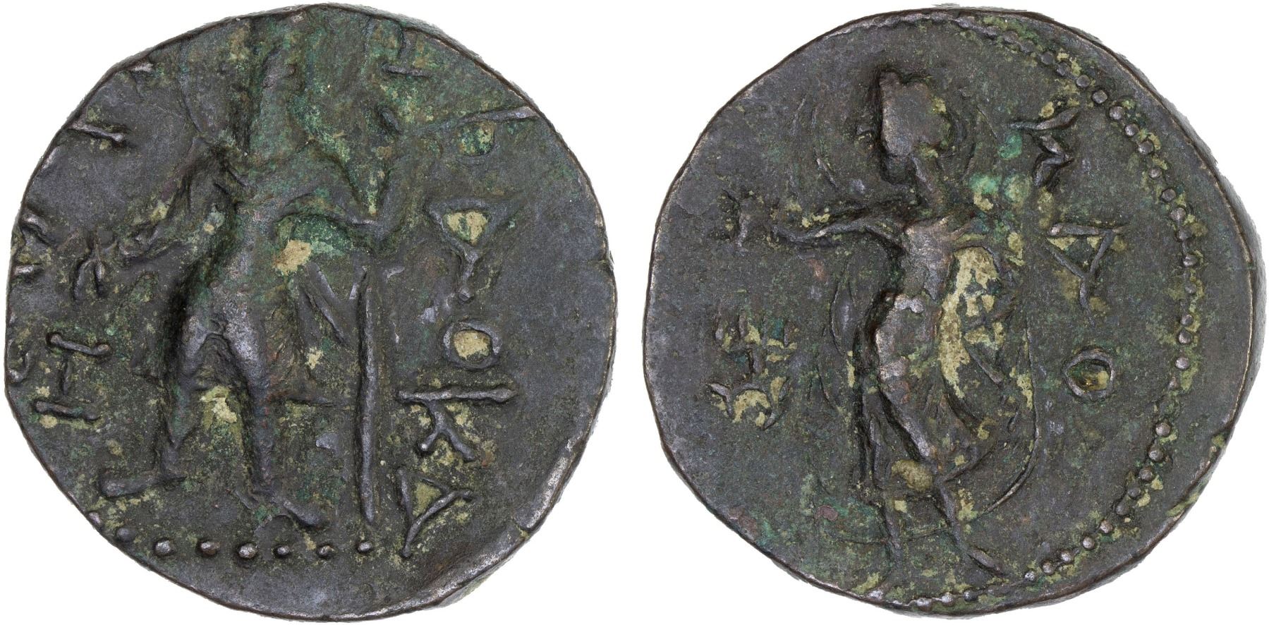 KUSHAN: Kanishka I, 127-151, AE tetradrachm (16.75g), G-801, king standing, offering at altar, short legend ÞAOKA NEÞKI // the lunar deity Mao standing, left hand raised on benediction, right hand akimbo, rare variety according to Göbl, choice VF-XF.