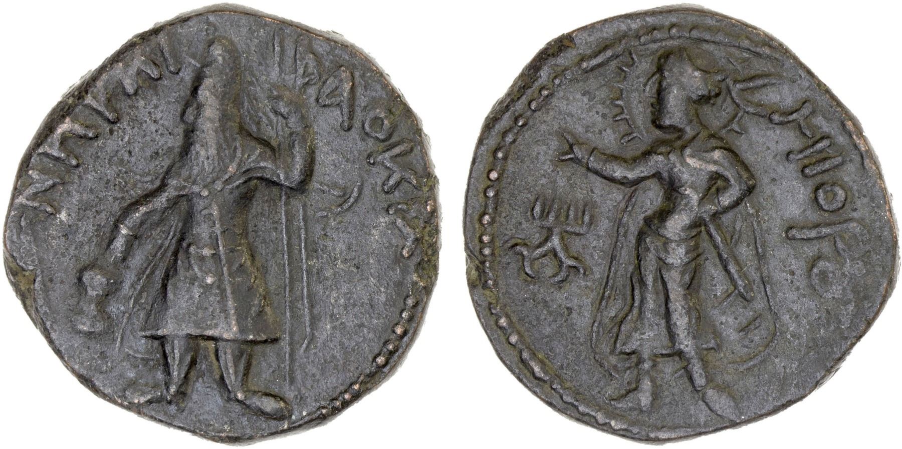 KUSHAN: Kanishka I, 127-151, AE tetradrachm (16.82g), ANS-425, king standing right, sacrificing over altar and holding scepter, short legend ÞAOKA NhÞKI // the sun deity Miiro, spelled MIORO, radiant, raising his right hand, his left arm akimbo, attractive patina, Choice VF.