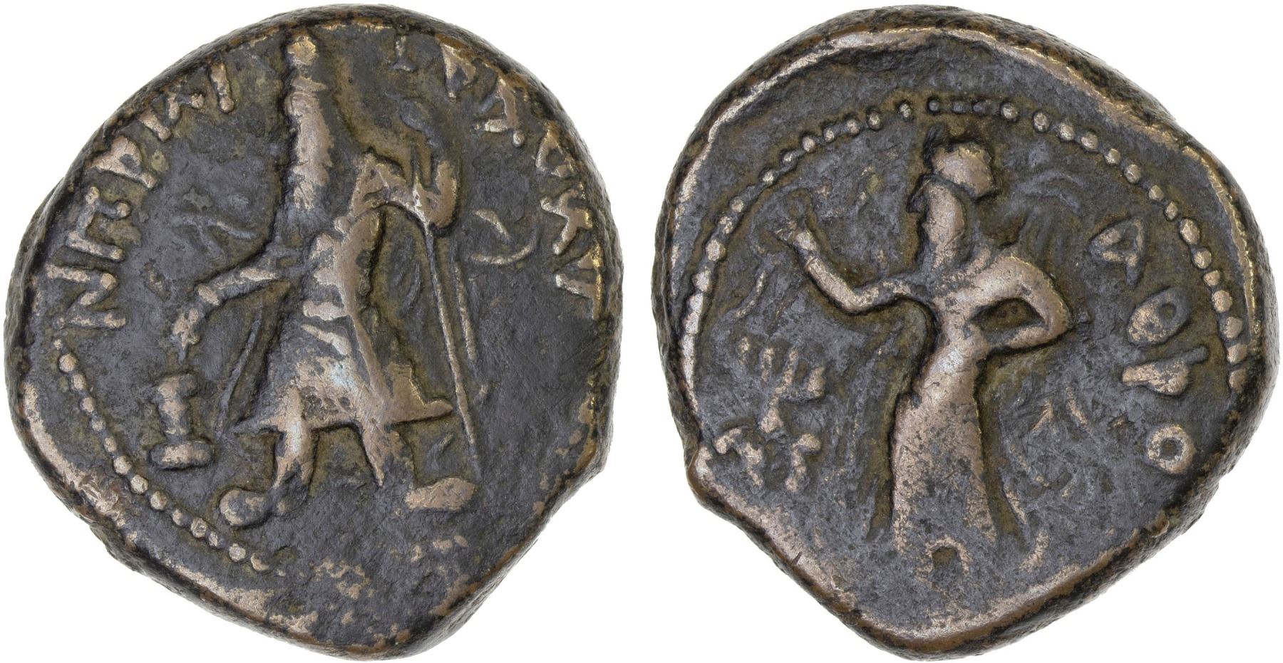 KUSHAN: Kanishka I, 127-151, AE tetradrachm (17.38g), ANS-459 ff, Göbl-772, king standing left, offering sacrifice over altar and holding trident // Athsho (god of metals) standing left, holding out diadem in right hand and resting left hand on hip, VF.