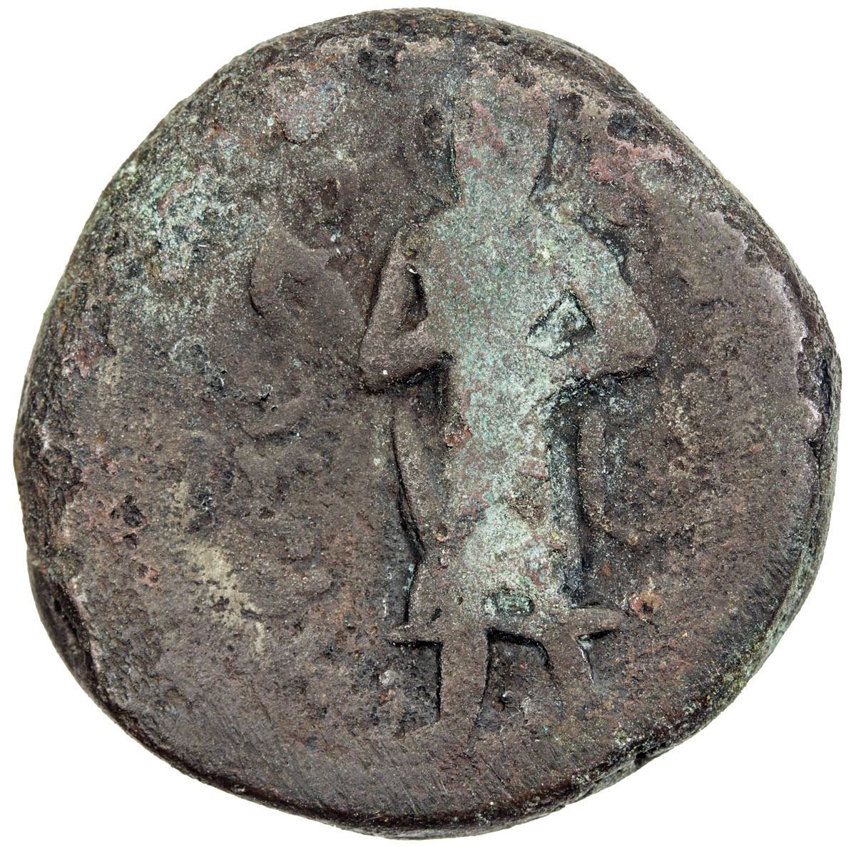 KUSHAN: Kanishka I, ca. 127-147, AE tetradrachm (7.96g), G-786, usual obverse for Kanishka // Buddha standing, inscribed SAKAMANO BOY?O around, usual unskillful strike for this type, Very Good, R, ex Skanda Collection, Lot 20.