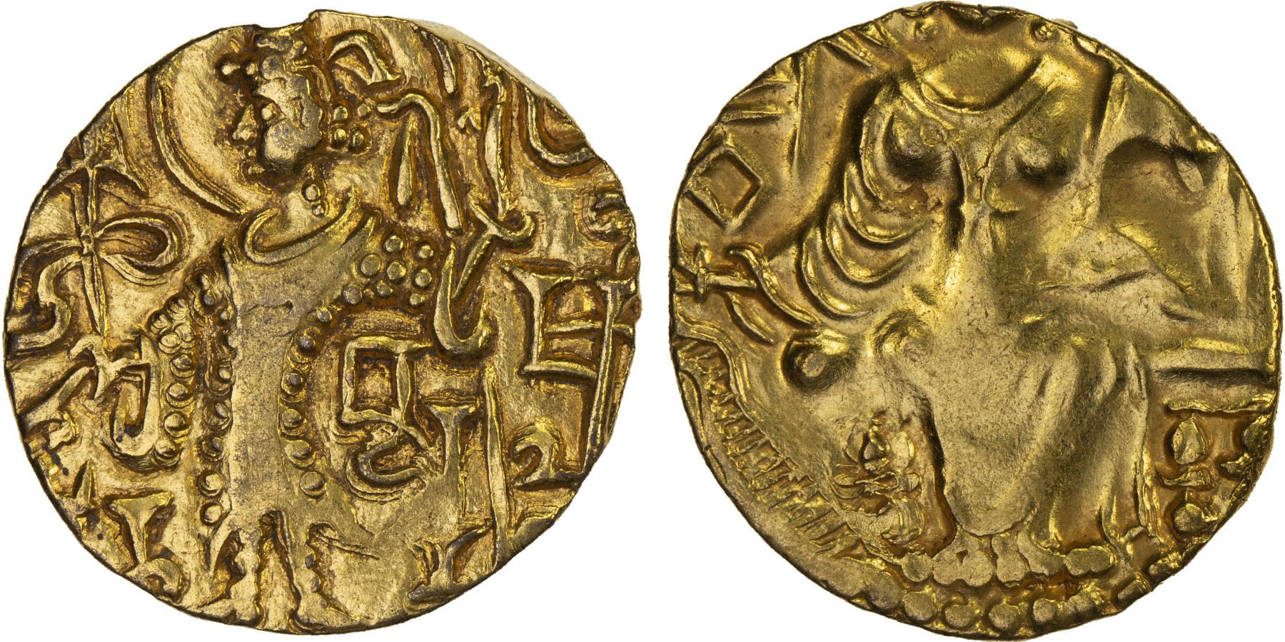 KUSHAN: Kipunada, ca. 360-375, AV dinar (stater) (7.57g), Mitch-3584/88, ANS-1682, king standing left, holding trident and sacrificing over altar, Brahmi Na / BaSaTa / KiPuNaDa // Ardoksho enthroned facing, holding garland and cornucopia, XF.