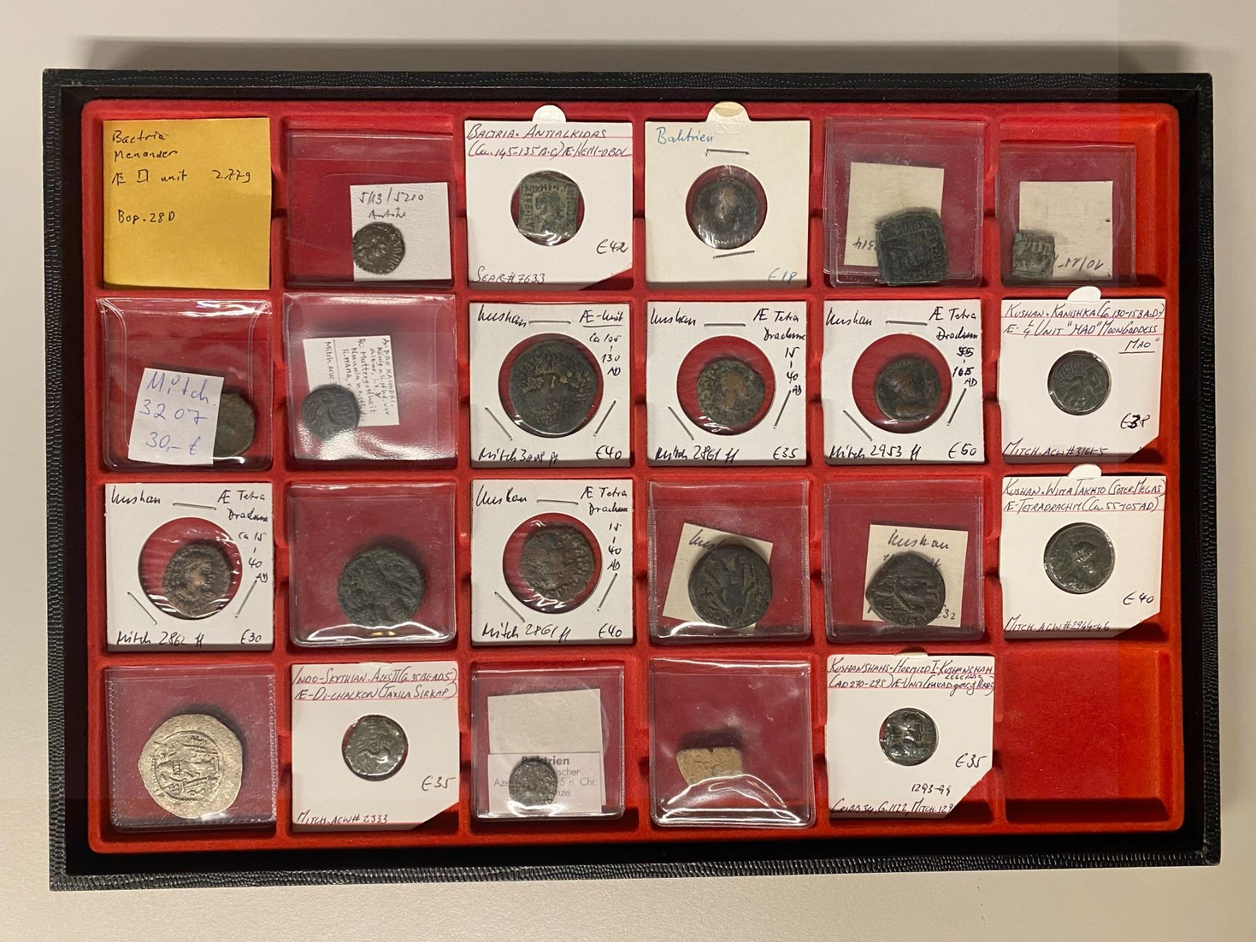 KUSHAN: LOT of 19 copper, 2 silver, and 1 clay seal, Kushan (13 pcs, copper, including Kujula Kadphises, Vima Tako, Vima Kadphises, Kanishka I, and Huvishka Kushano-Sasanian (1, Hormizd I); Hephthalite (1, Göbl-288, porous surfaces); Bactria (4 copper, including Menander & Apollodotus I, and 1 silver, Hermaios); and Indo-Scythian (1 silver & 1 copper, and 1 lead seal); average VG to Fine, many with various fawls); retil value $625, lot of 22 pieces.