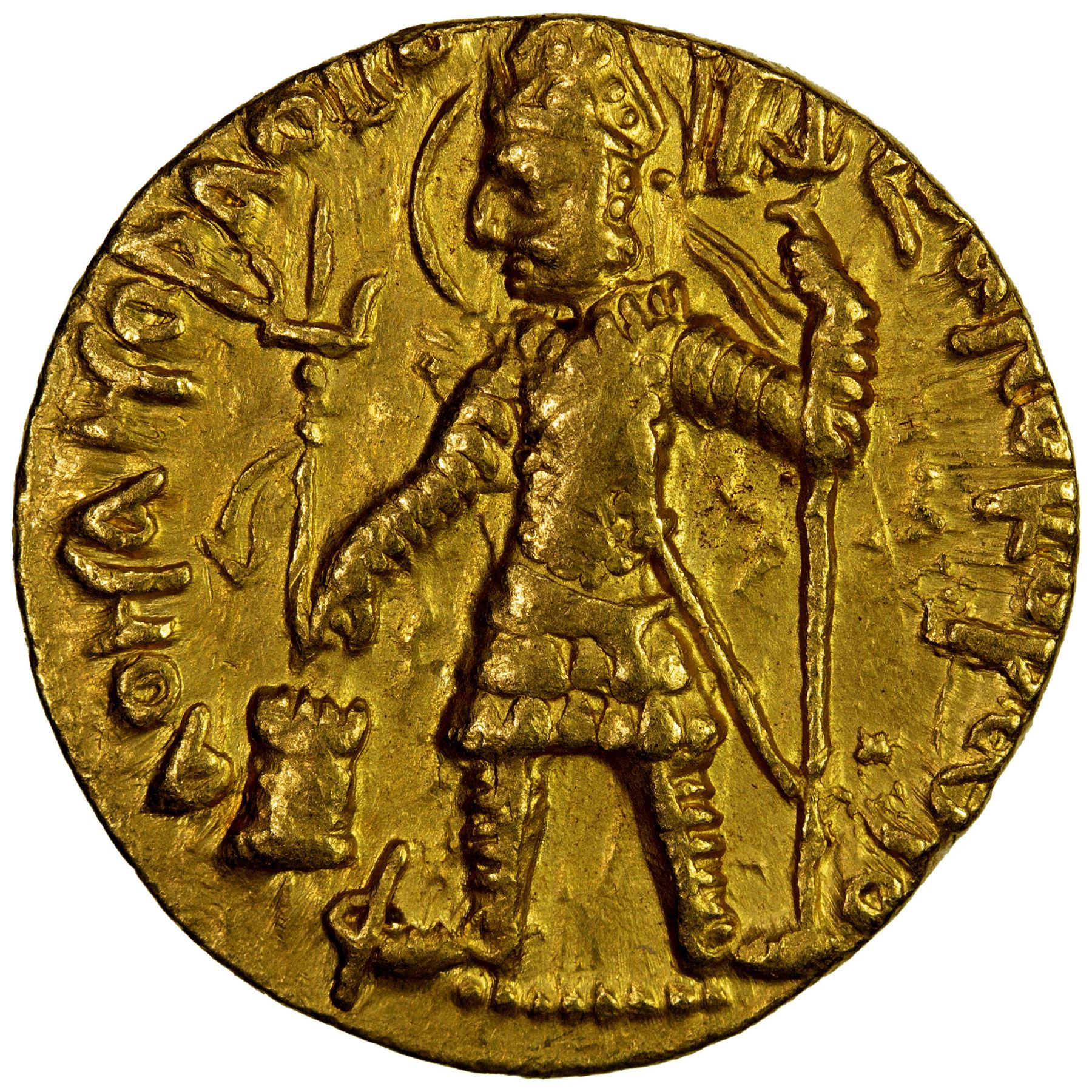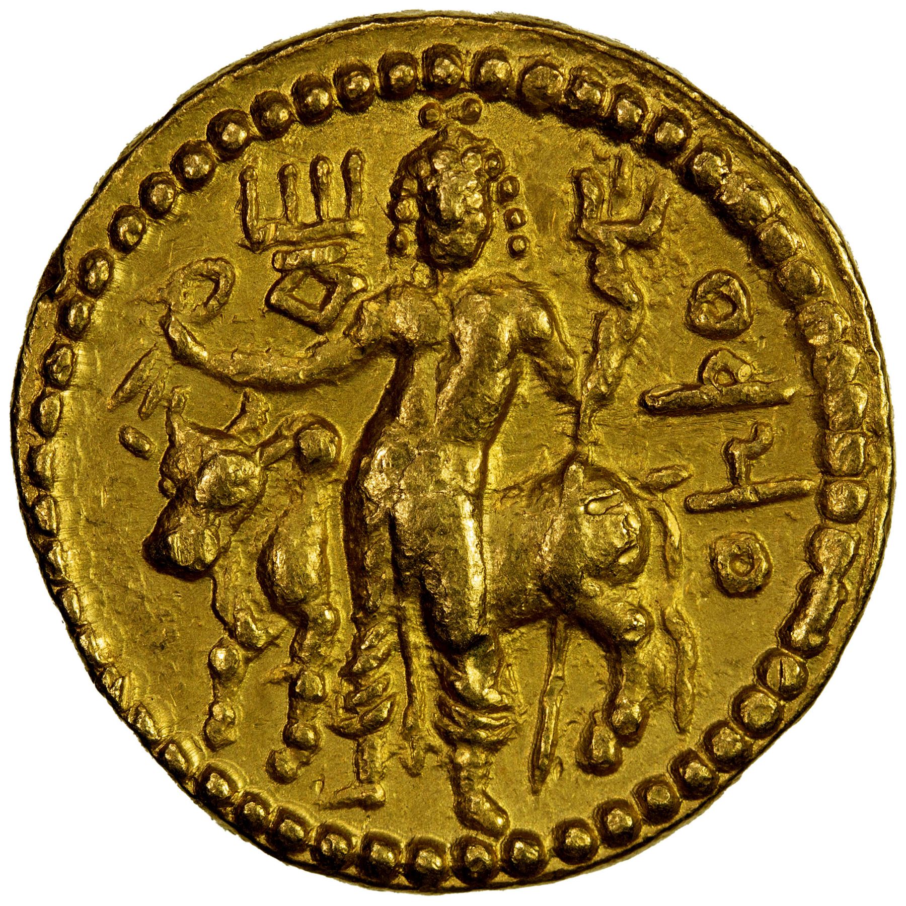 KUSHAN: Vasu Deva I, 190-230+, AV dinar (7.97g), Mitch-3389/94, king standing, second series with second trident to left above the altar // Siva & bull, style assigned by Mitchiner to the Peshawar region, fine style, VF to EF.