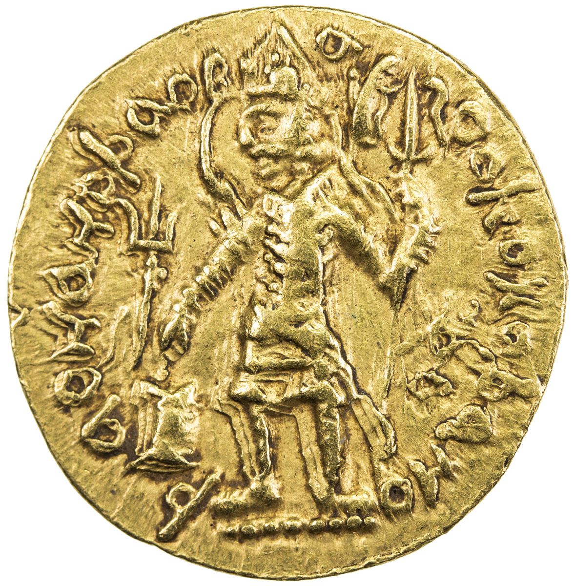 KUSHAN: Vasu Deva I, ca. 191-230+, AV dinar (7.98g), G-640, Mitch-3395, king standing, holding long trident, offering sacrifice on altar, with second trident, nandipada to right // Siva & bull Nandi, superb strike on broad flan, bold VF, ex Skanda Collection, Lot 54. The nandipada, the footprint of Nandi the bull, was added either very late in his reign, or posthumously. This would be of the earliest style with the nandipada.