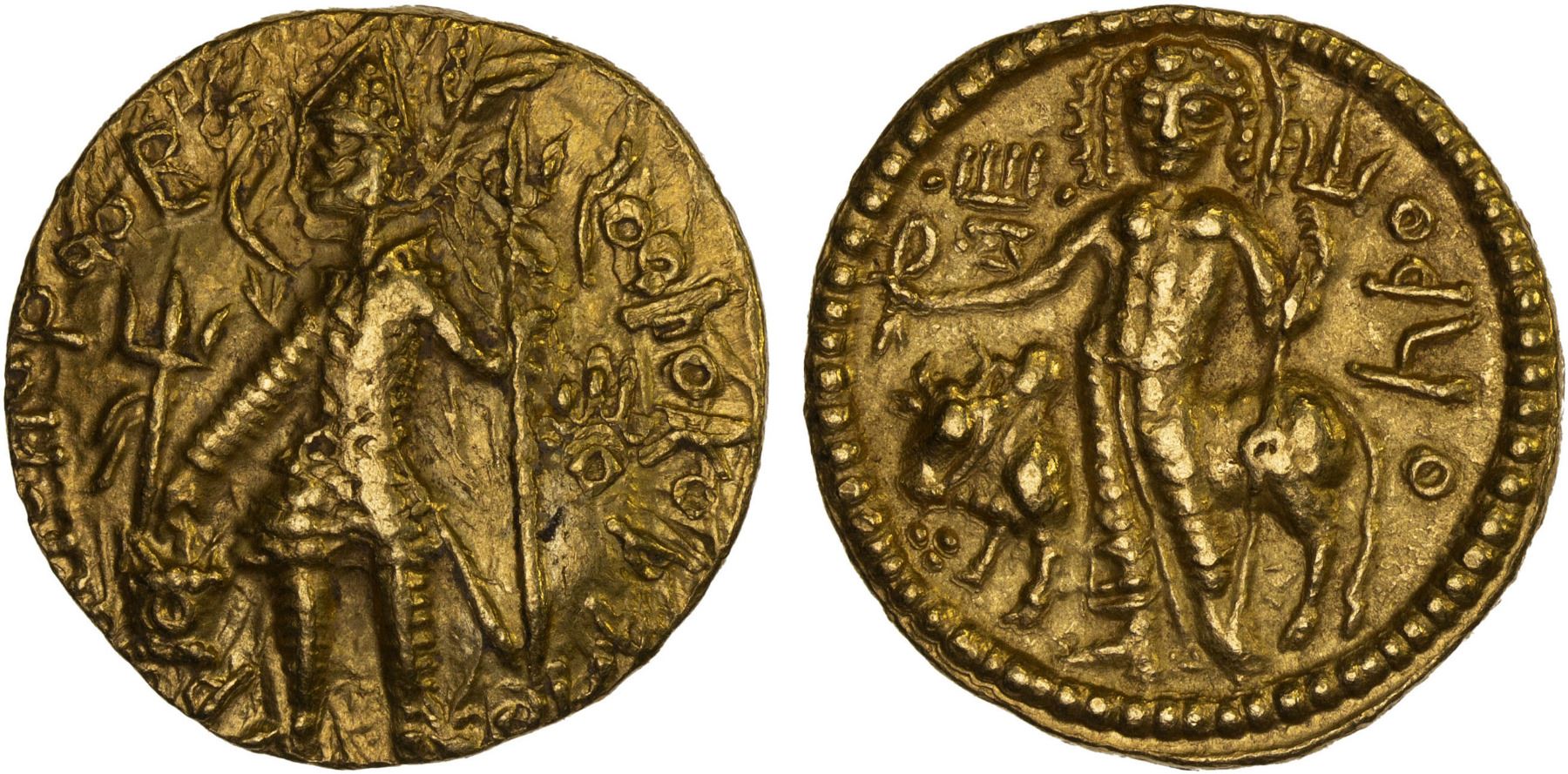 KUSHAN: Vasudeva I, ca. 190-230, AV dinar (stater) (7.98g), Mitch-3389-94, ANS-1087-90, king standing left, offering sacrifice at altar with altar, holding a second trident, ÞAONANOÞAO BA-ZODHO KOÞANO // Siva standing facing, holding diadem and trident, Nandi the bull standing left behind him, tamgha to left, OhþO to right, three pellets below Nandi's head, faint die shift and small scratch on obverse, Choice XF.