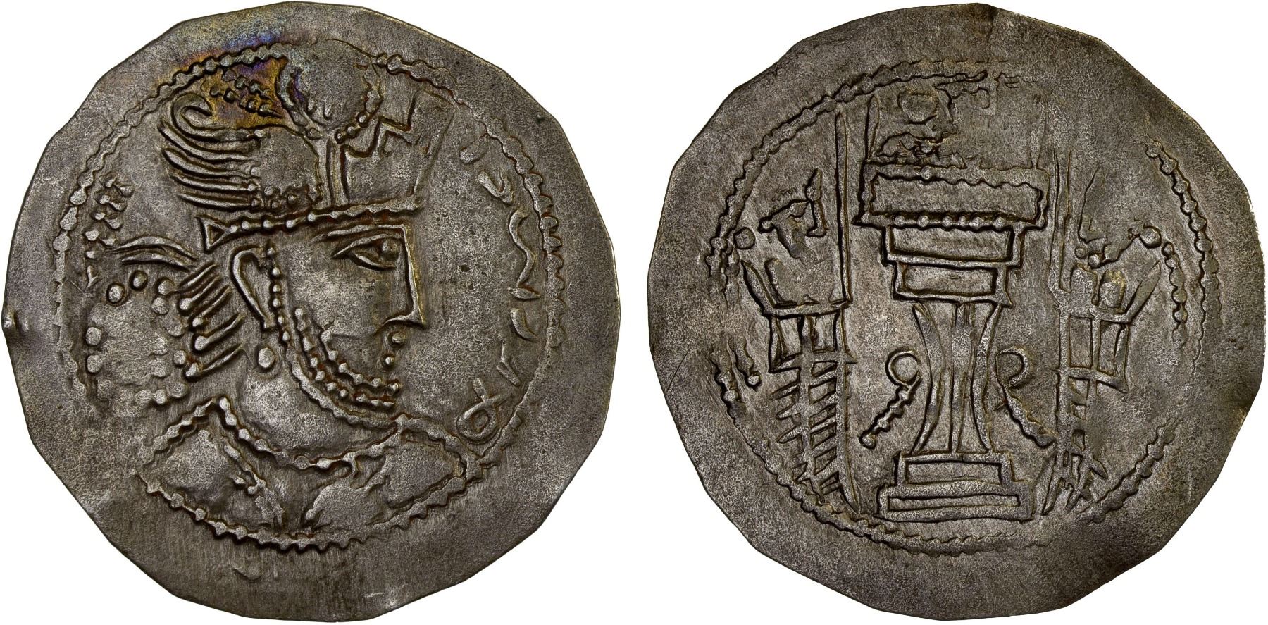 KUSHANO-SASANIAN: Anonymous, late issue, ca. 400-425, AR drachm (3.71g), Mitch-1321/23, Göbl-30, imitating the standard Sasanian drachm of Varhran IV (388-399), broad flan, bold VF, R.