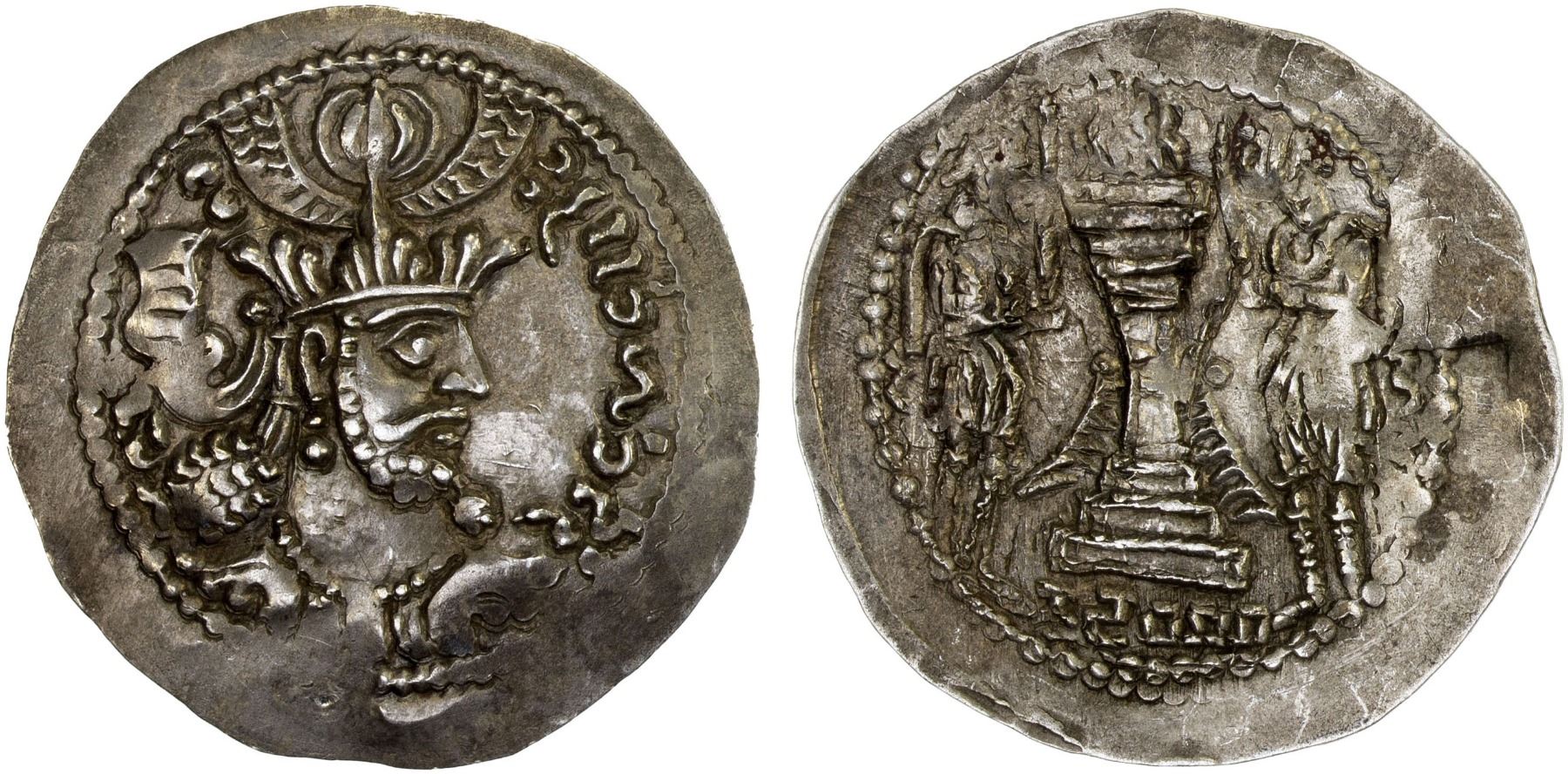 KUSHANO-SASANIAN: temp. Varhran, ca. 335-370, AR drachm (3.78g), Cribb-178, Mitch-1305, Sasanian style obverse & reverse, with Varhran wearing an ornate winged crown; struck during the Kidarite period; trace of a countermark of unknown type on the reverse, XF.