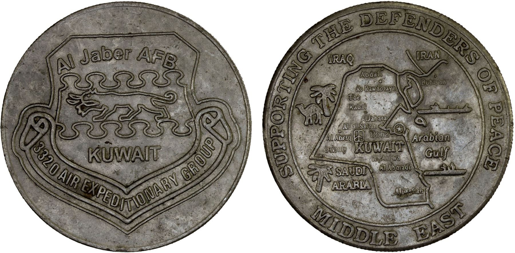 KUWAIT: Al Jaber Air Force Base, medal (29.23g), ND, 40mm unsigned copper-nickel medal for the 3320 Air Expeditionary Group at Al Jaber Air Force Base, line drawing of tiger (?) with "Al Jaber AFB above and KUWAIT below, all within shield with "3320 AIR EXPEDITIONARY GROUP on banner below // map of Kuwait and surroundings with locations identified and SUPPORTING THE DEFENDERS OF PEACE - MIDDLE EAST around, obverse rim nick, reeded edge, XF, ex Dr. Wolfgang Schuster Collection. This was the central U. S. air base during the First Gulf War.