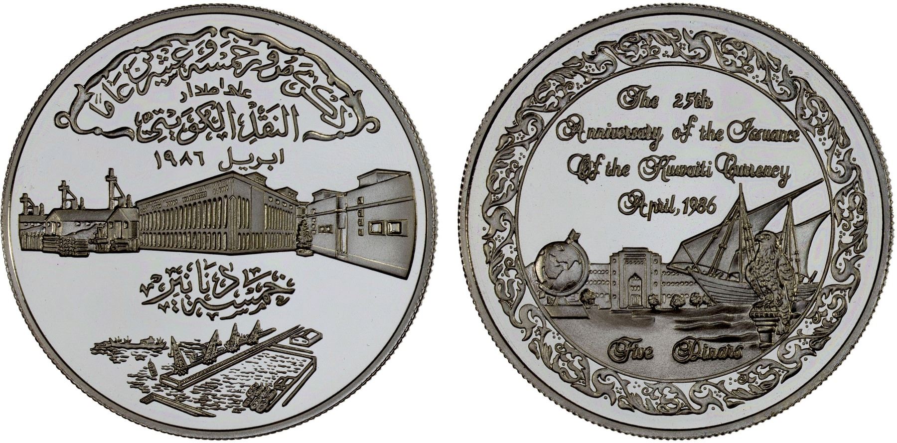 KUWAIT: Sheikh Jaber Al Ahmad Al Sabah, 1977-2006, AR 5 dinars, 1986, KM-20, 25th Anniversary of Kuwait Currency, Choice Proof, ex Dr. Wolfgang Schuster Collection.