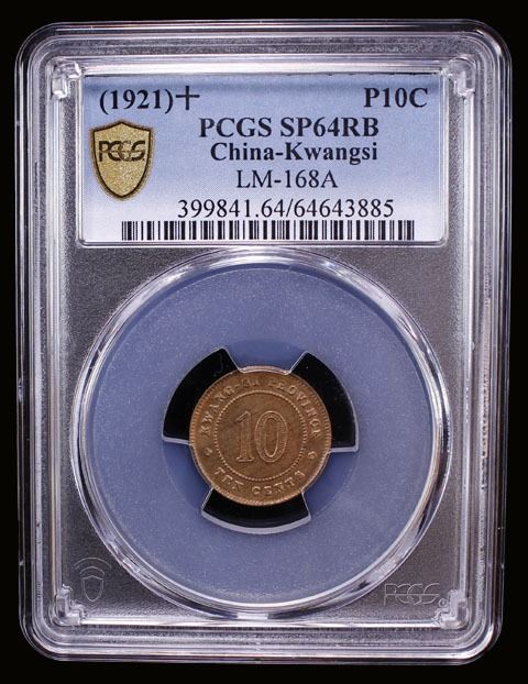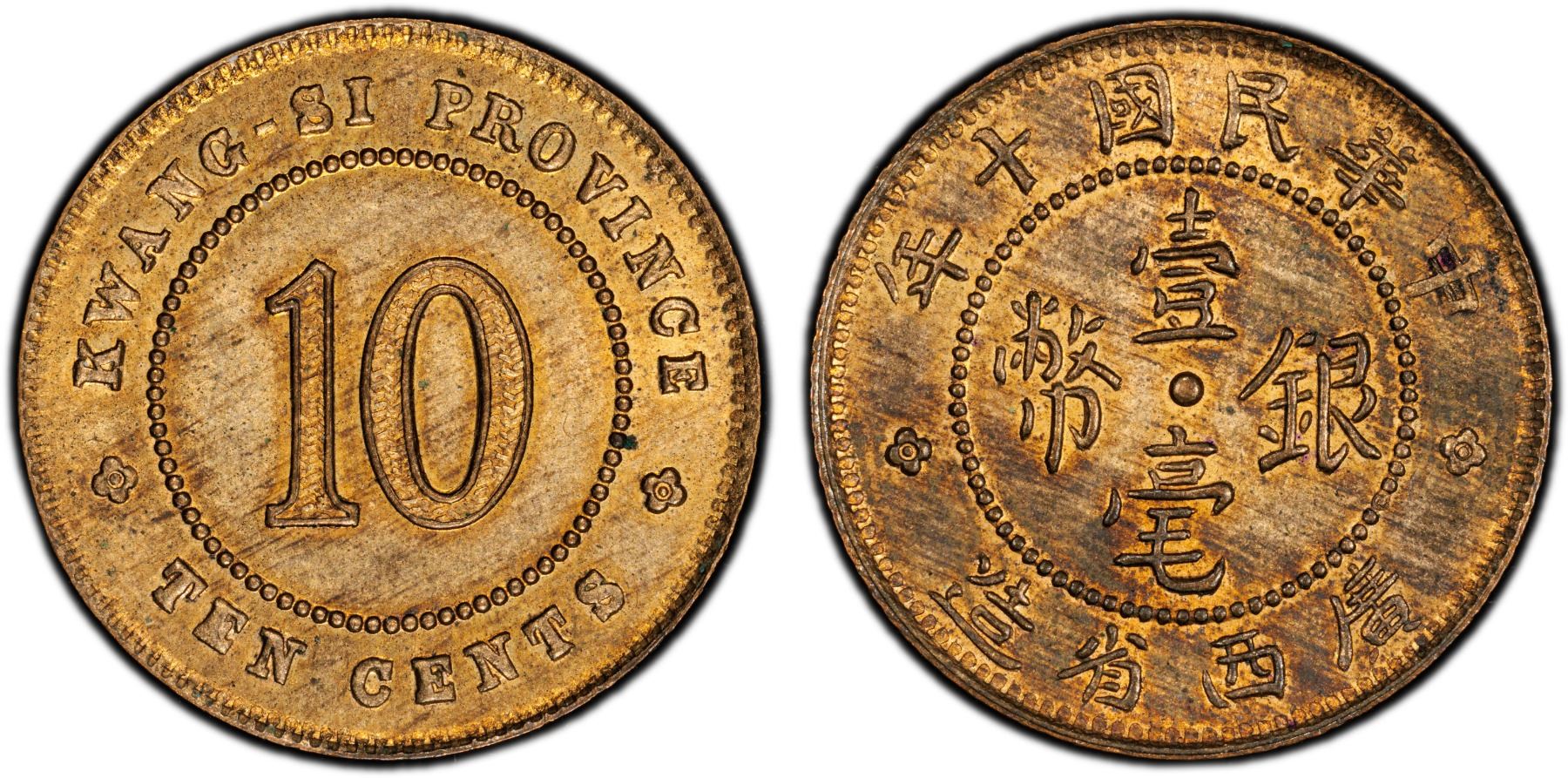 KWANGSI: Republic, AE 10 cents, year 10 (1921), PCGS Specimen 64 RB