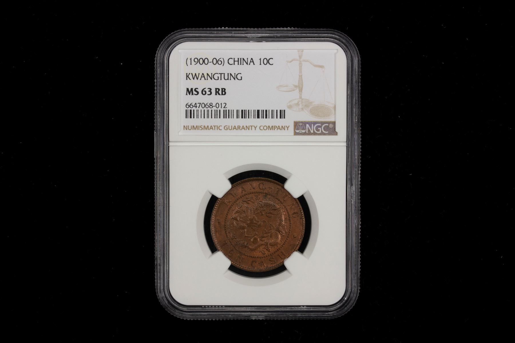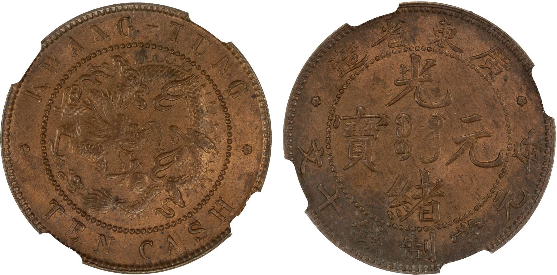 KWANGTUNG: Kuang Hsu, 1875-1908, AE 10 cash, ND (1900-06), Y-193, CL-KT.07, variety with 7 spines below pearl, lovely orange patina with ample luster, NGC graded MS63 RB.