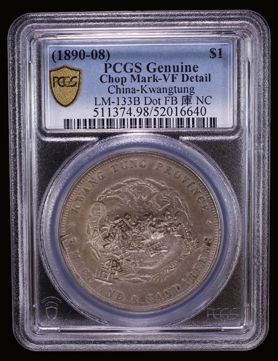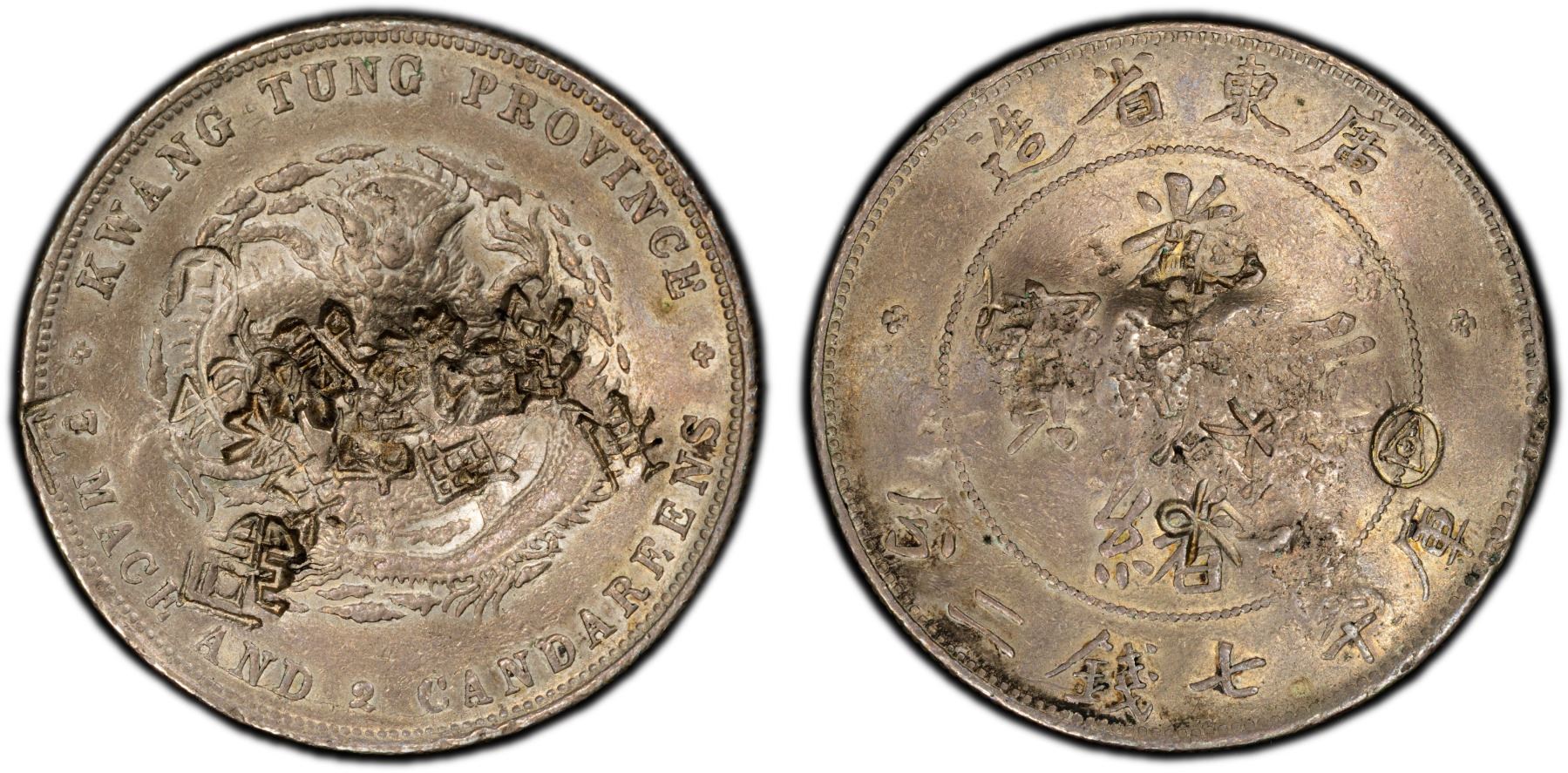 KWANGTUNG: Kuang Hsu, 1875-1908, AR dollar, Canton, ND (1890-1908), KM-203, L&M-133B, K-26, struck from Heaton Mint dies, variety with small rosettes and dot on fireball, variety with character ku not connected, with multiple large Chinese merchant chopmarks, PCGS graded VF details, ex Dr. Dirk Löer Collection.