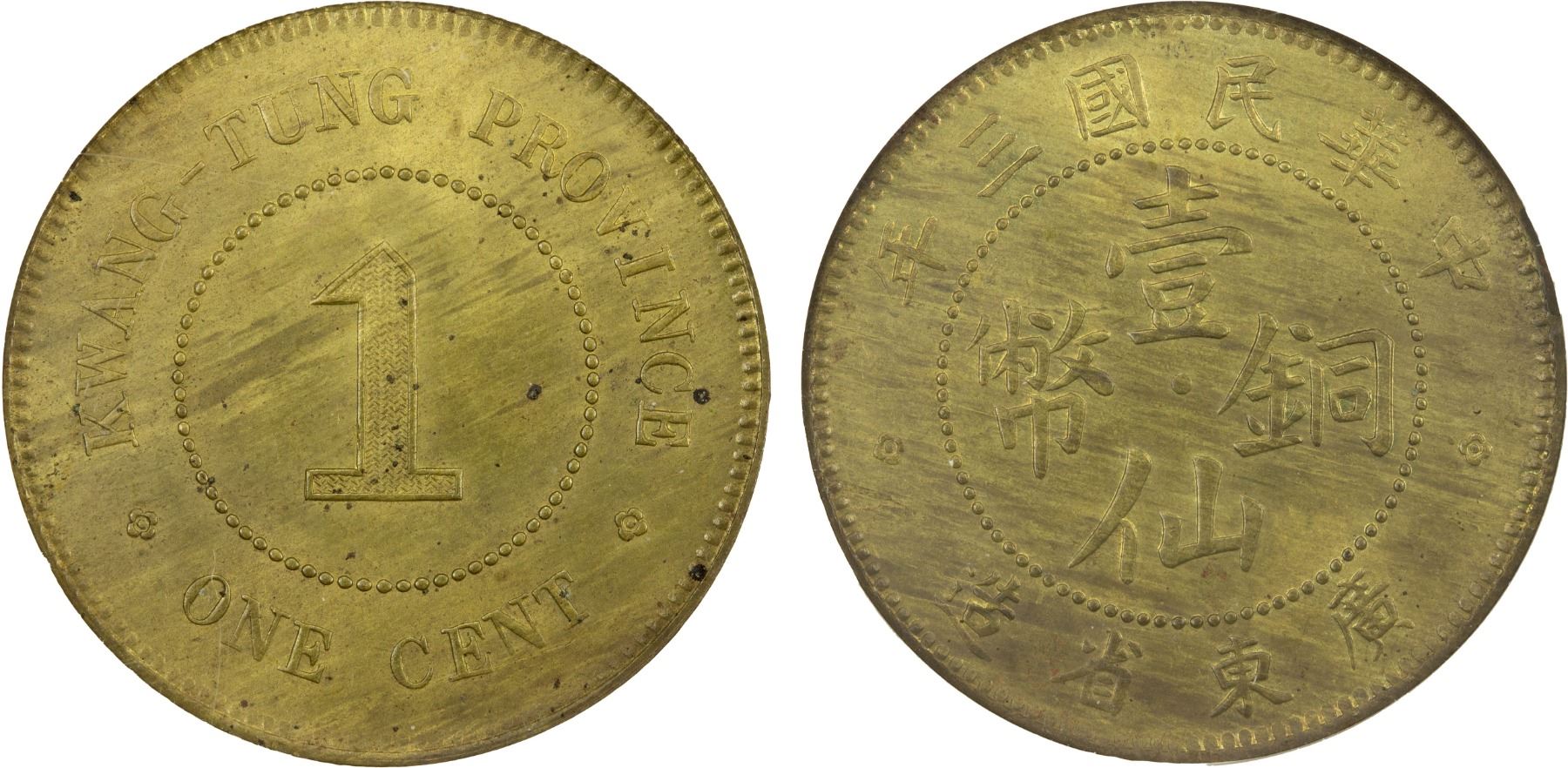 KWANGTUNG: Republic, cent, year 3 (1914), Y-417A, scarcer brass subtype, better date, NGC graded MS63, ex The 1914 Collection.
